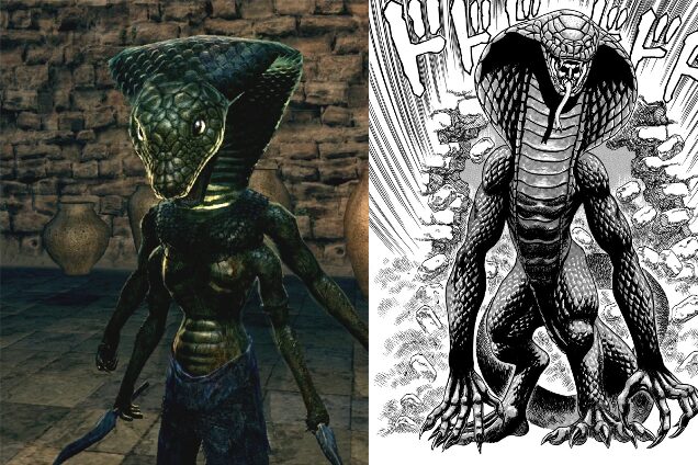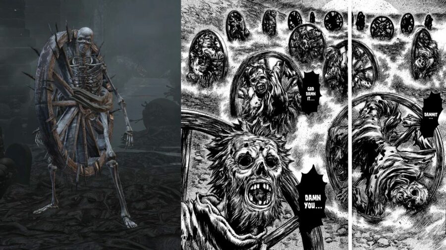 The trend of Kentaro Miura turning standard enemies from his favorite game series into legendary characters continues with Dark Souls’ Darkwraiths and the Skull Knight, an enigmatic figure shrouded in mystery who is in no way King Gaiseric. The Darkwraiths and the Skull Knight both wear similarly ribbed armor and have an exposed skull for a face, framed by spikes. Beyond the aesthetic likeness, both characters actually share a few points of lore: namely, a city that was destroyed and a populace sacrificed to stop a great power, now buried beneath an ashamed kingdom. This assumes of course that the Skull Knight is King Gaiseric, a man of similar build with a skull helmet only seen riding a horse who has every reason to oppose the God Hand and was also called the Skull King in his time, but no one can make that call— certainly not the Berserk wiki which has them split into two separate pages.