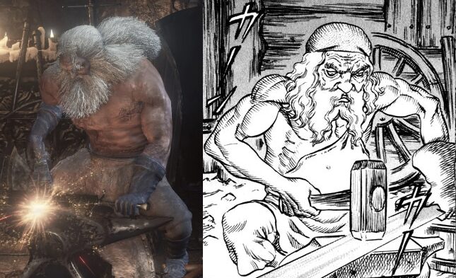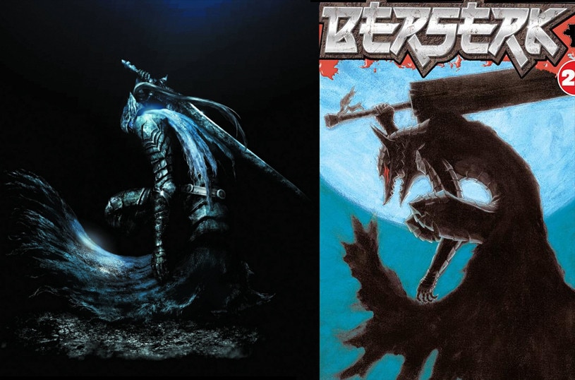 In 2012, Dark Souls introduced gamers to a tormented legend in its first and only DLC: Artorias of the Abyss, a cursed swordsman with an unwieldy greatsword slung over his back and a bum arm that lends him a uniquely ferocious moveset. Artorias bristles with rage and dark power, his soul in a constant struggle with himself that is nothing short of sublime. Artorias’s legacy is complicated however by a string of unfortunate copycats, and Guts, with his similar oversized weapon, disability, and predisposition for sick forward somersaults of questionable tactical benefit, leads the pack. His iconic Berserker armor, acquired in the Falcon of the Millennium Empire Arc, even goes so far as to ape Artorias’s wolf motif. It’s a loving homage to a game Miura clearly held in high regard, but we’d love to see the mangaka step out of his comfort zone once in a while and try his hand at some original designs.