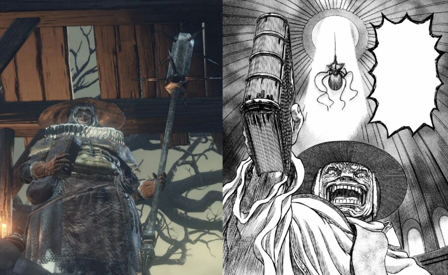 The concept of religious zealotry has existed for tens if not dozens of years before Dark Souls III gave us one of its more memorable enemies, the Cathedral Evangelists of the Undead Settlement, but that doesn’t make their particular brand of faith—preaching with an iron grip and a scalding embrace—any less shocking. What most Souls players don’t know is that these intimidating figures, Bible thumpers in more ways than one, were actually the basis for another memorable antagonist: Father Mozgus from Berserk’s Conviction Arc. Not only is Mozgus a fearsome inquisitor who terrorizes the city of Albion with torture and fanaticism, he wears the same wide-brimmed hat as the Evangelists and even smashes a villager’s head with his Bible in an attack that is ripped straight from Dark Souls if the order of release for these two properties eludes you as much as it does me.