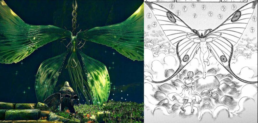 The Dark Souls community owes Berserk a debt of gratitude for taking an otherwise middling boss like the Moonlight Butterfly and giving it a beautiful, heart-wrenching backstory in the manga’s overlooked Lost Children Arc. Rosine, an abused girl who nurtures a secret belief that she’s an elf and runs away from her village to join her kind, where she succumbs to the transformative, corrupting magic of a Behelit, is the arc’s major antagonist, and her Apostle form will look familiar to fans of FromSoft’s unprompted middle finger to melee builds, the Moonlight Butterfly. When fully transformed as a graceful yet grotesque luna moth hybrid, Rosine is actually a better boss than the Moonlight Butterfly; where the latter spams two attacks fifteen times consecutively and then takes a little nap, Rosine uses her proboscis, stinger, and supersonic speed to thrilling effect in her fight with Guts. Is she thematically ill-suited for Dark Souls? Probably. Is it weird that she’s topless? A little. But these are the tradeoffs we make so we can experience art made by men.