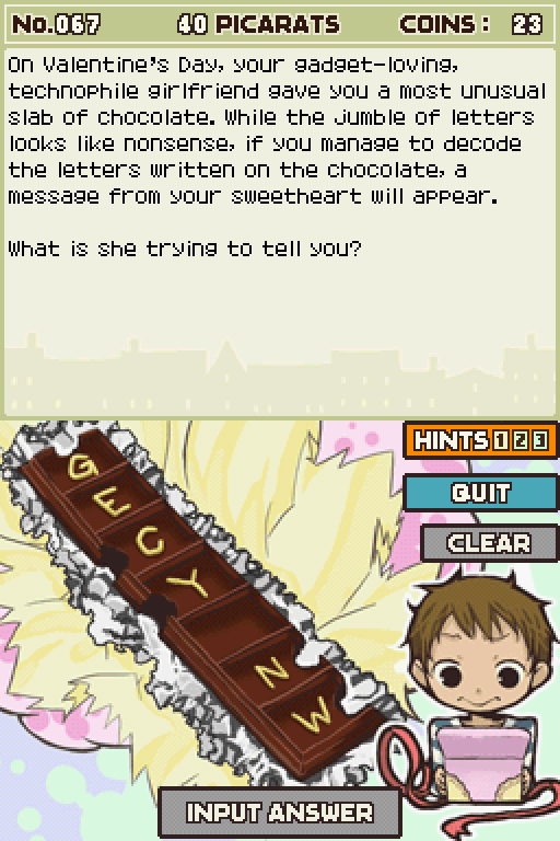 Even if IQ was an actual thing that mattered, I won’t pretend that answering a bunch of brain teasers tied together by a Japanese impression of British stereotypes is the way to measure it, especially since a lot of the Professor Layton series’s puzzles are very, very stupid, as seen above.