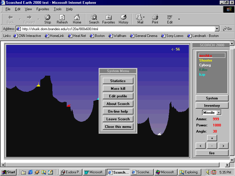 Heavy roller. Funky bomb. Sand bomb. The NUKE. This was the vocabulary of my youth. When your computer’s graphic card isn’t powerful enough to play many games but you want to play online with your friends what do you do? You google “free online multiplayer games.” And what do you find deep down on page 1000 or whatever? You find Scorched Earth 2000.
