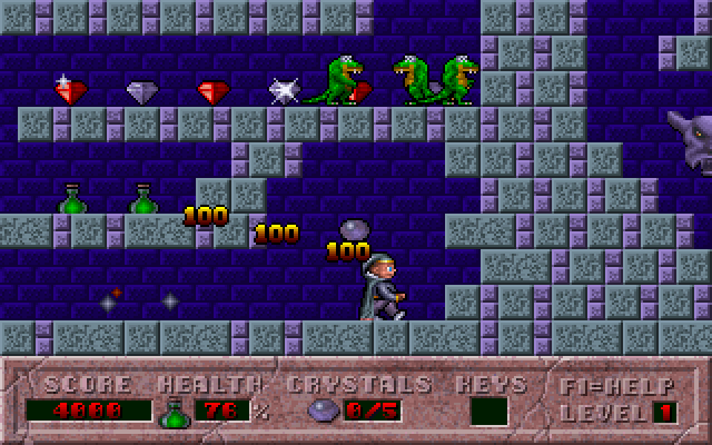Like all good classic DOS games, the story of this game is told entirely through 10 pages of full-screen walls of text that are squirreled away in their own menu option called “Legends and Hints!” As the story delves deep into worldbuilding, explaining how a Council of Wizards use “dimensional shortcuts” to jump between worlds, it becomes abundantly clear that this was some developer shoving his Tabletop RPG game’s lore into what is otherwise a very straightforward game about collecting orbs and shooting crocodiles? Maybe they’re meant to be some sort of Kobold?