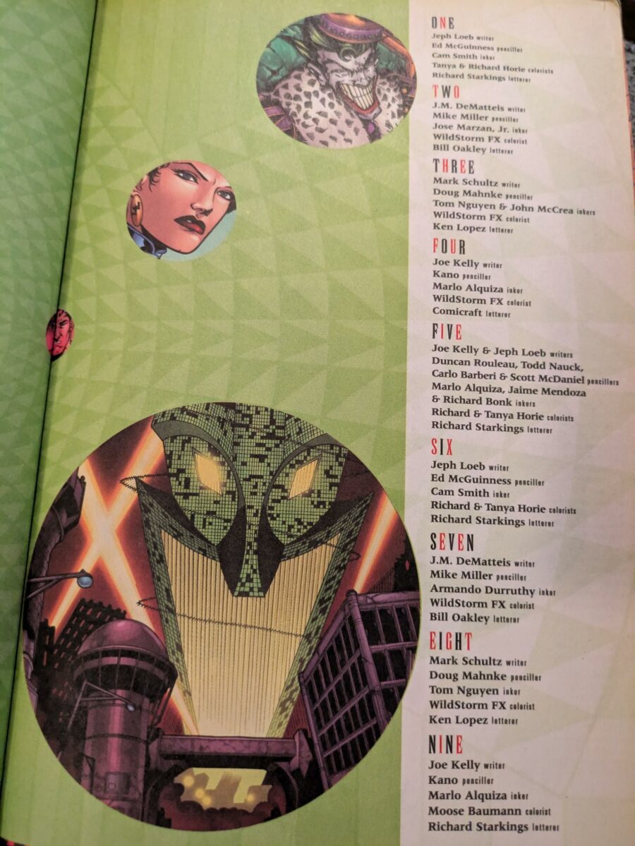 And I wouldn’t deny anyone that experience, instead I’m going to swerve and talk about Emperor Joker. And that’s going to be tricky, because Emperor Joker wasn’t a planned, prestige, mega-collection, it was a story that stretched across the normal monthlies of various ongoing Superman titles. Passed from the hands of Jeph Loeb, JM DeMatteis, Mark Schultz, and Joe Kelly and that’s not even getting into the artists! Except I am getting into them! Don’t like it? Don’t read comics! We’ve got Ed McGuinness, Cam Smith, Tanya & Richard Horle, Richard Starkings, Mike Miller, Jose Marzan Jr., Kano, Marlo Alquiza, Carlo Barberi, Scott McDaniel, Duncan Rouleau, Todd Nauck, Jaime Mendoza, Richard Bonk, Richard Starkings, Armando Durruthy, Bill Oakley, Ken Lopez, and Moose Baumann along with WildStorm FX and Comicraft (WHEW!)