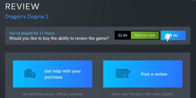 “Capcom simply wants to ensure that the people leaving a review are passionate about leaving a review,” said Fletcher. “You can easily earn your review by just playing a few hours of the game anyway. You get it in the second town. Takes a few hours. Only suckers actually pay for it.”