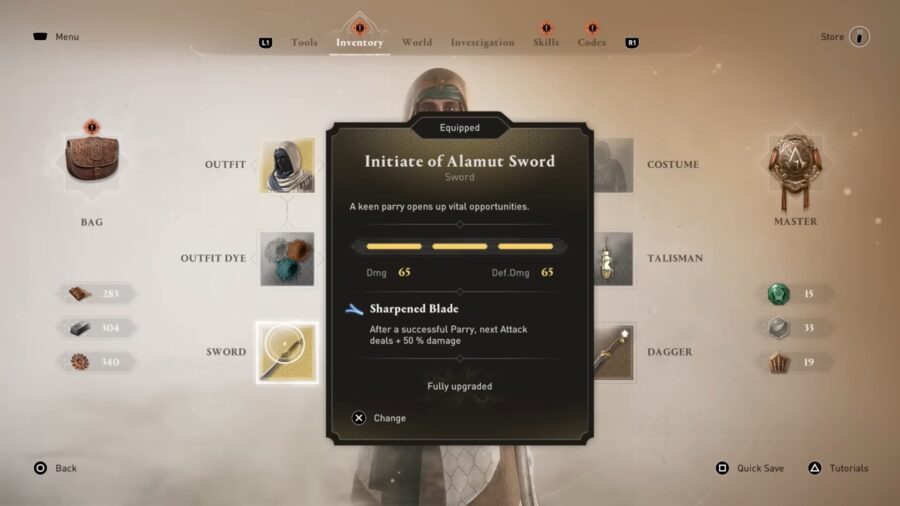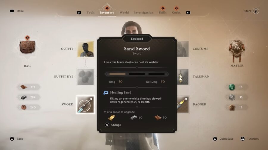 This Prince of Persia tie-in weapon is a part of the DLC included in the Deluxe Edition of Assassin’s Creed Mirage. While damage output is comparable to the Alamut, its perk Healing Sand will restore 20% of Basim’s health with every kill, but only when time is slowed. This is great to offset the cost and hassle of acquiring Elixirs to replenish health mid-combat, and you won’t have to randomly scavenge for food post-battle either. Additionally, you can hold off on expending two skill points on the Elixir Pocket skill, at least not until you need to progress further down the Trickster skill tree.
