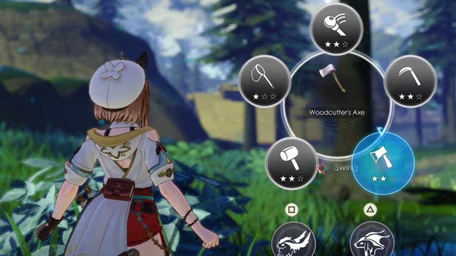 Just like in previous games in the Atelier franchise, basically, every tool must be crafted in Ryza’s atelier. Before you have them, you can gather only a few types of material whether by hand or using Ryza’s staff. But you don’t need to worry too much about that, since most items you need to craft some basic tools – Woodcutter’s Axe, Hammer, and Grass Sickle – are accessible to you through both methods.