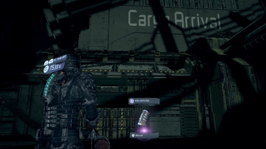 First up is Voelker’s rig, which you might have already found prior to starting the quest, you can find it in the oxygen-deprived Hangar where Hammond previously switched off the gravity back in Chapter 2. Head right to the back and look for the Cargo Arrival sign on the far left, you’ll see the rig on the floor.