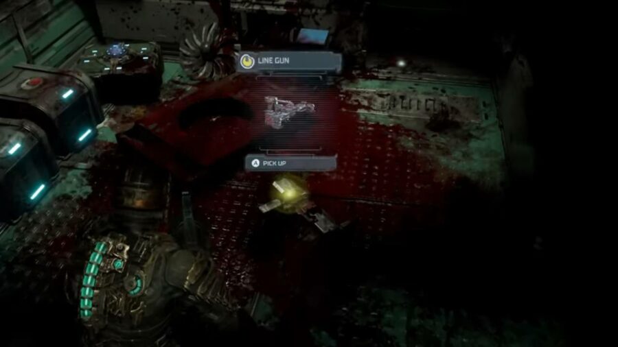 This door is not hard to spot as there aren’t many doors in the area. Upon entering, you will find a bloody room with the Line Gun in the center, alongside the corpse of a crew member. As per the previous patterns, the dead body holds the weapon, and you can collect it by approaching the crew member.
