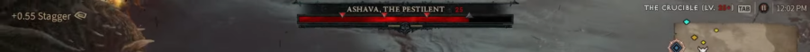 - Ashava’s health bar has four inverted red triangles above it, at equidistant points. As her health is whittled down below each, the triangles flip over and turn gray, dispensing health potions onto the ground (as with any boss). These points could also be used as indicators for the deployment of new moves in her attack routine; although nothing yet apparent seems to trigger from the final two triangle inversions.