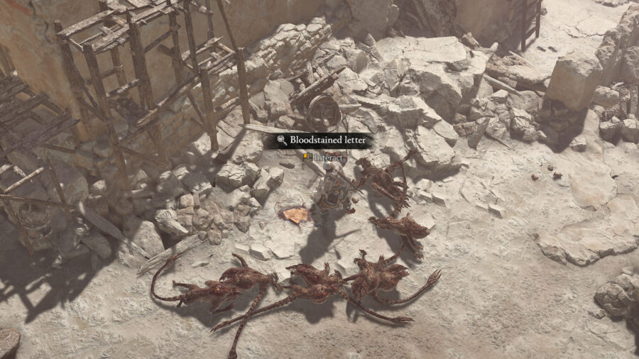 Southeast of said town is an area with several mobs. After clearing them out, players should notice a figure coated in salt kneeling in front of a bundle of papers. Clicking this Bloodstained Letter will begin the quest. Players must track down Little Tuya.