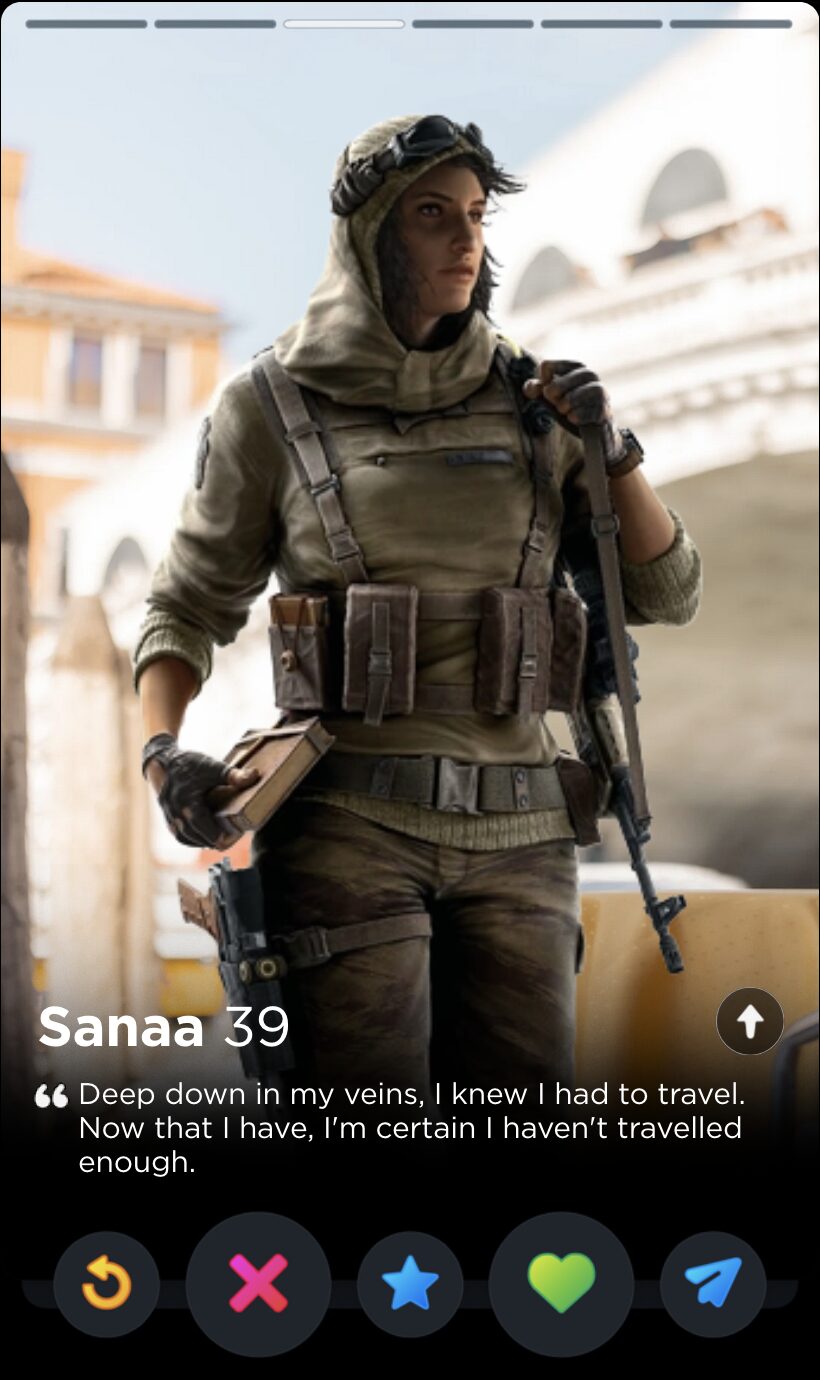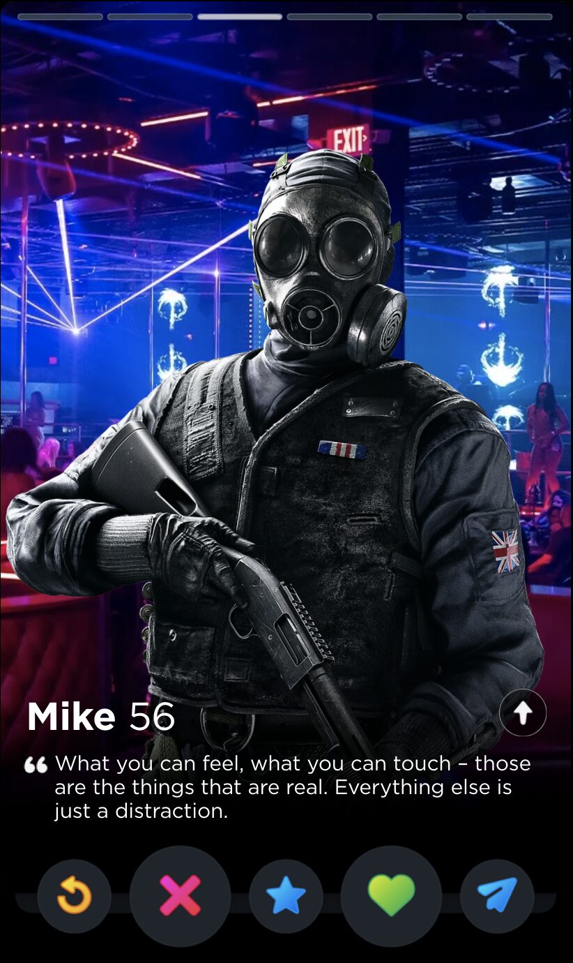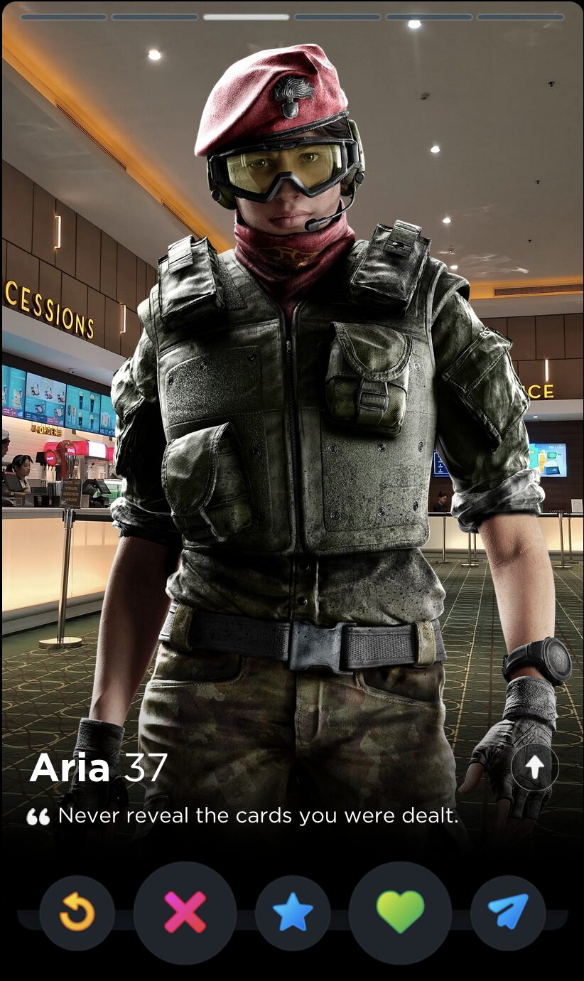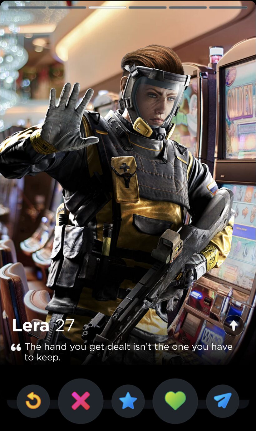 Ubisoft must have forgotten about Finka’s Operator quote by the time they introduced Alibi that same year, because there’s not half a lick of difference between “Never reveal the cards you were dealt” and “The hand you get dealt isn’t the one you have to keep”. Maybe they play cards together. The latter quote works far better in the only context that matters, though: finding the love of your life on the dating app that, for a limited time in April, would let you “test your flirting skills” with an AI in a feature called The Game Game, which is a bit of true information I deliver to you devoid of joke or satirical spin.