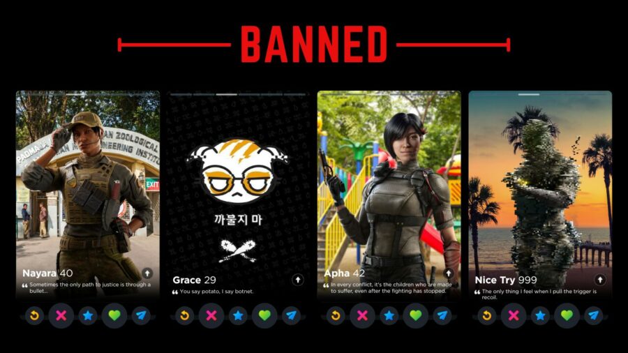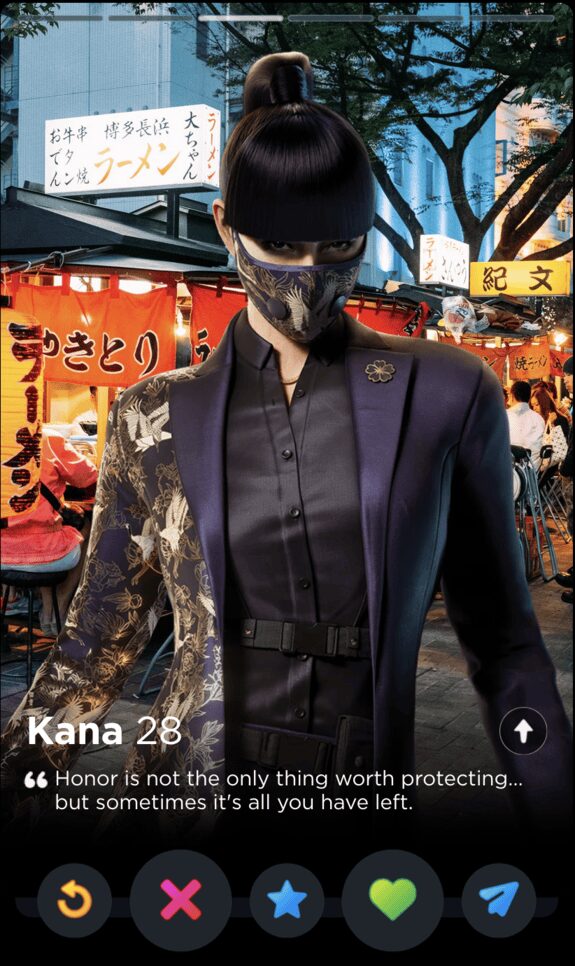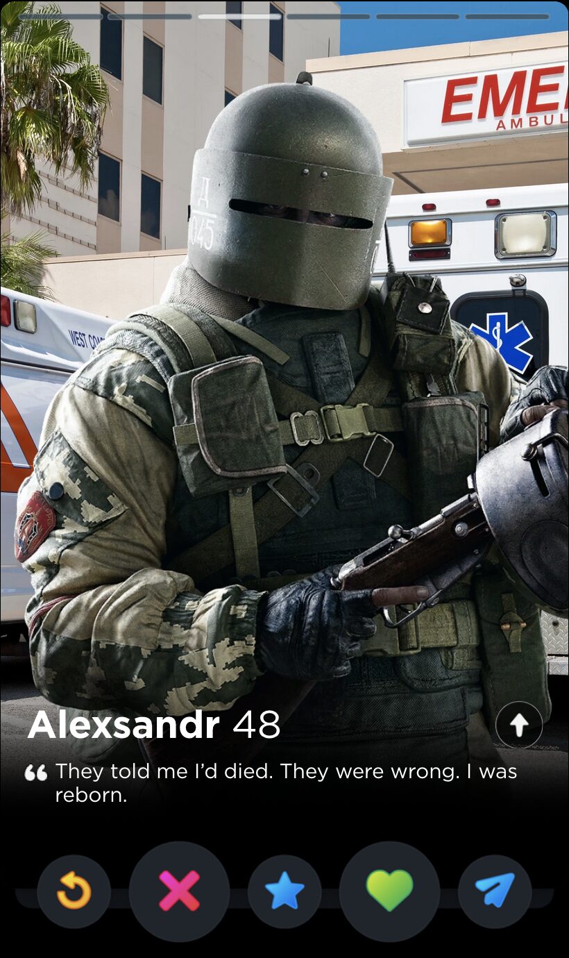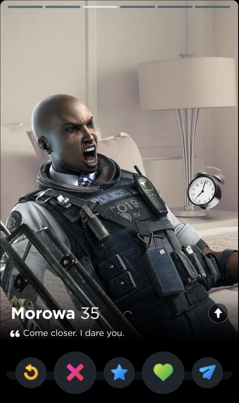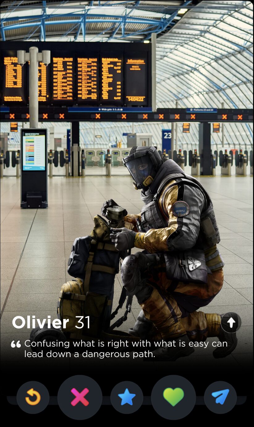 Ubisoft must have forgotten about Finka’s Operator quote by the time they introduced Alibi that same year, because there’s not half a lick of difference between “Never reveal the cards you were dealt” and “The hand you get dealt isn’t the one you have to keep”. Maybe they play cards together. The latter quote works far better in the only context that matters, though: finding the love of your life on the dating app that, for a limited time in April, would let you “test your flirting skills” with an AI in a feature called The Game Game, which is a bit of true information I deliver to you devoid of joke or satirical spin.