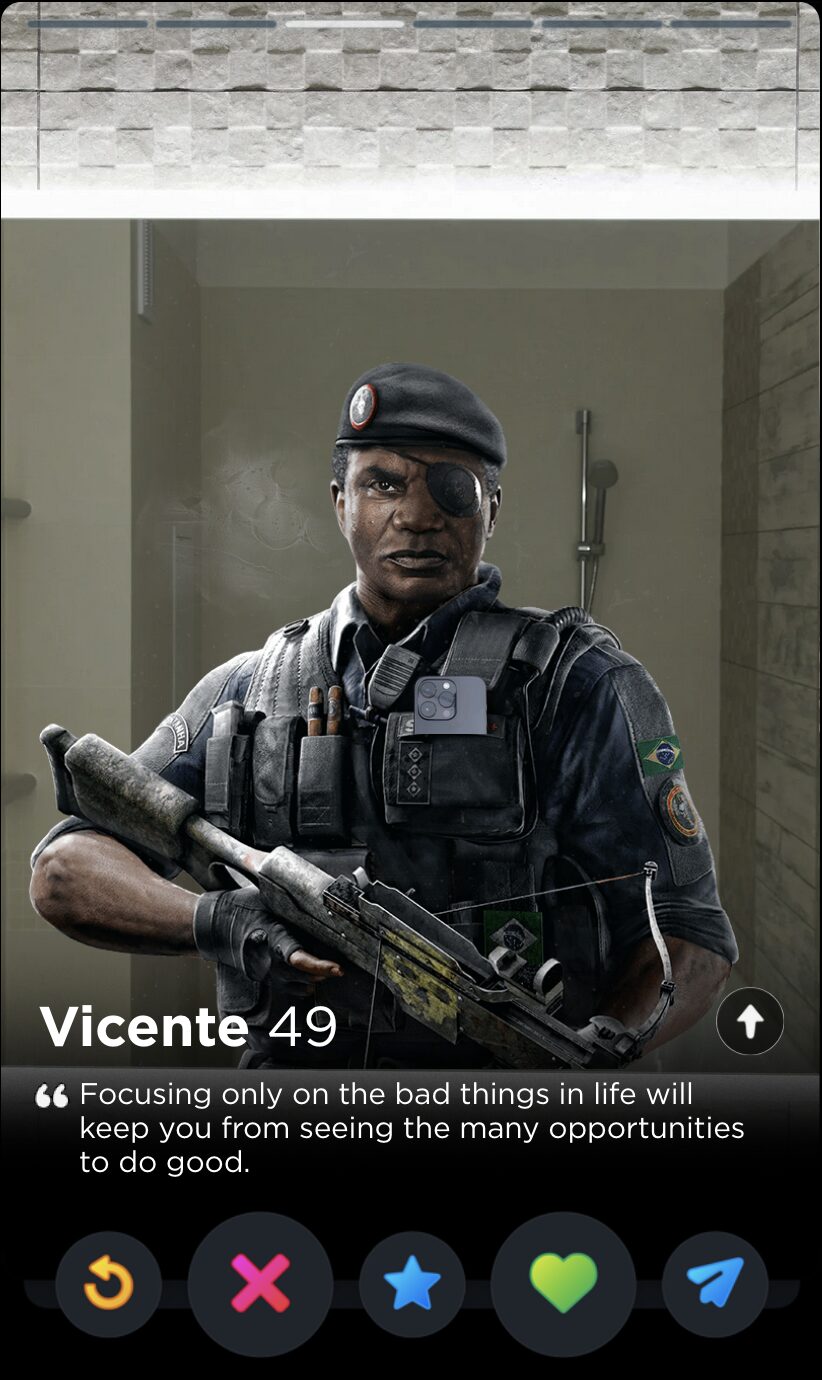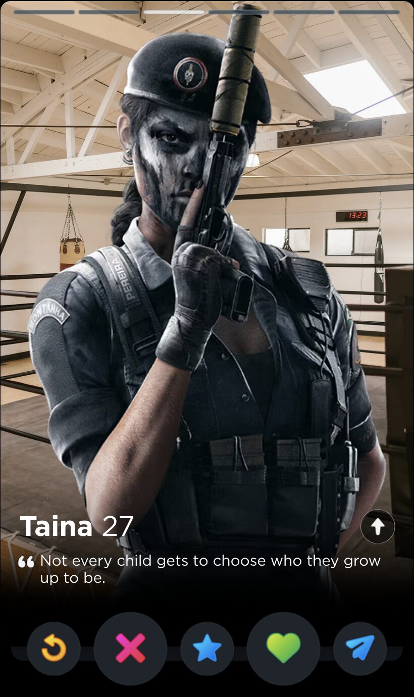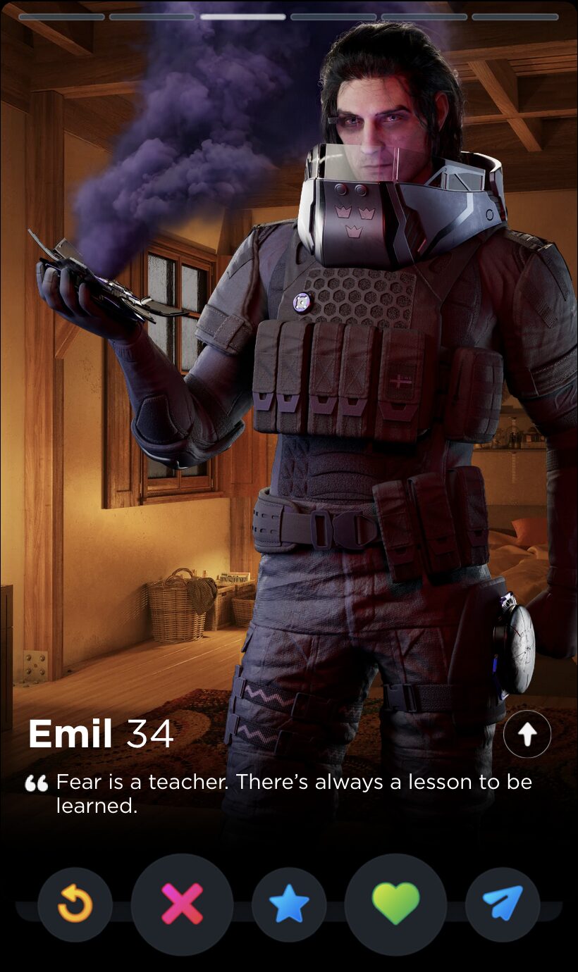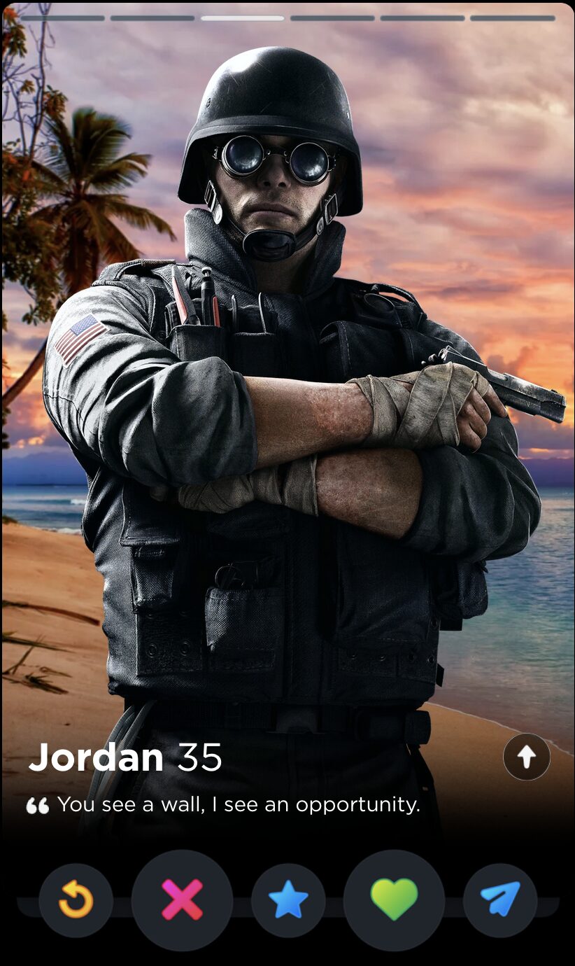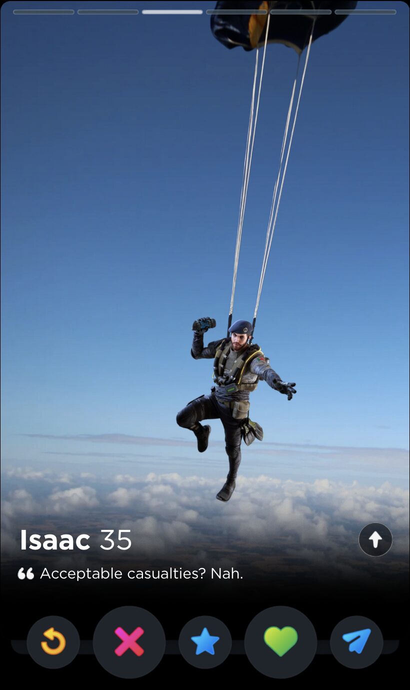 IQ’s quote is fun and full of whimsy, two words I would never use to describe my years playing Rainbow Six Siege. Though it’s a touch impersonal, this is the kind of playful observation that can tell you a lot about someone’s worldview, which makes it a good fit for Tinder, where things like worldview and personality are given as much if not more consideration than appearances.