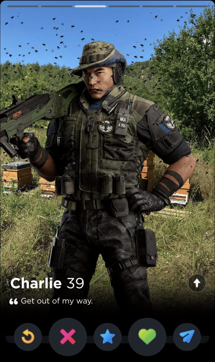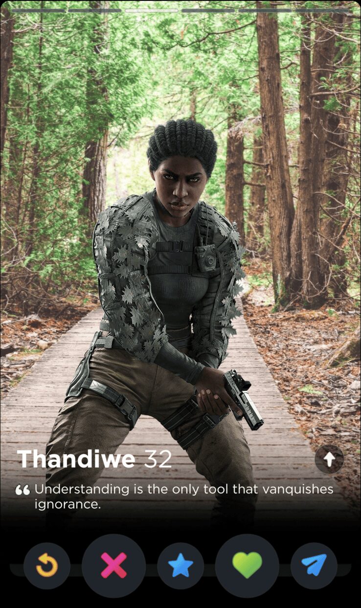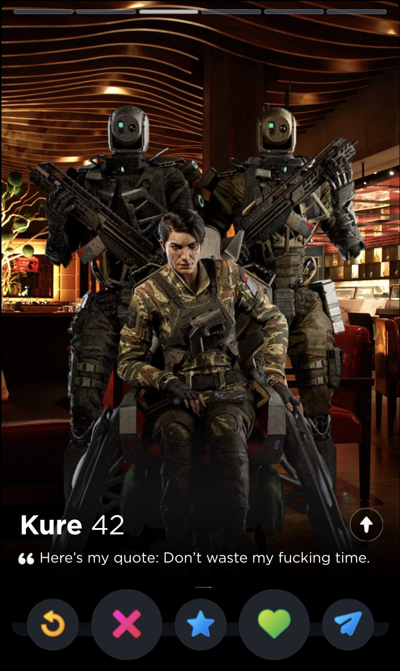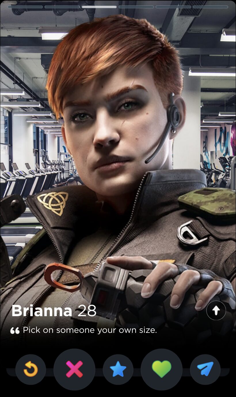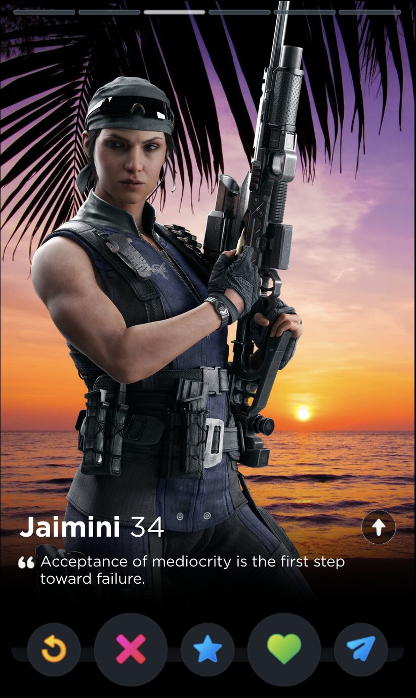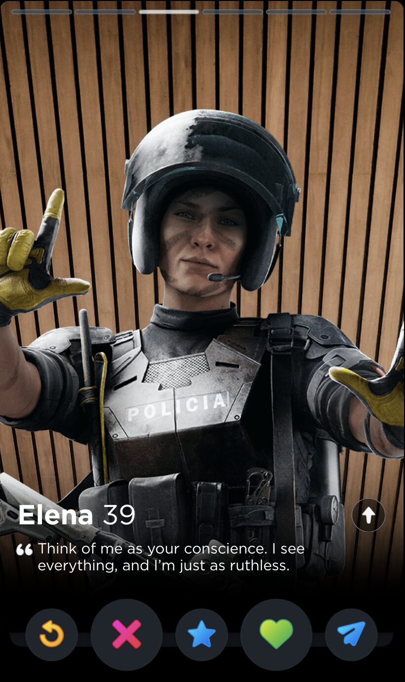 IQ’s quote is fun and full of whimsy, two words I would never use to describe my years playing Rainbow Six Siege. Though it’s a touch impersonal, this is the kind of playful observation that can tell you a lot about someone’s worldview, which makes it a good fit for Tinder, where things like worldview and personality are given as much if not more consideration than appearances.