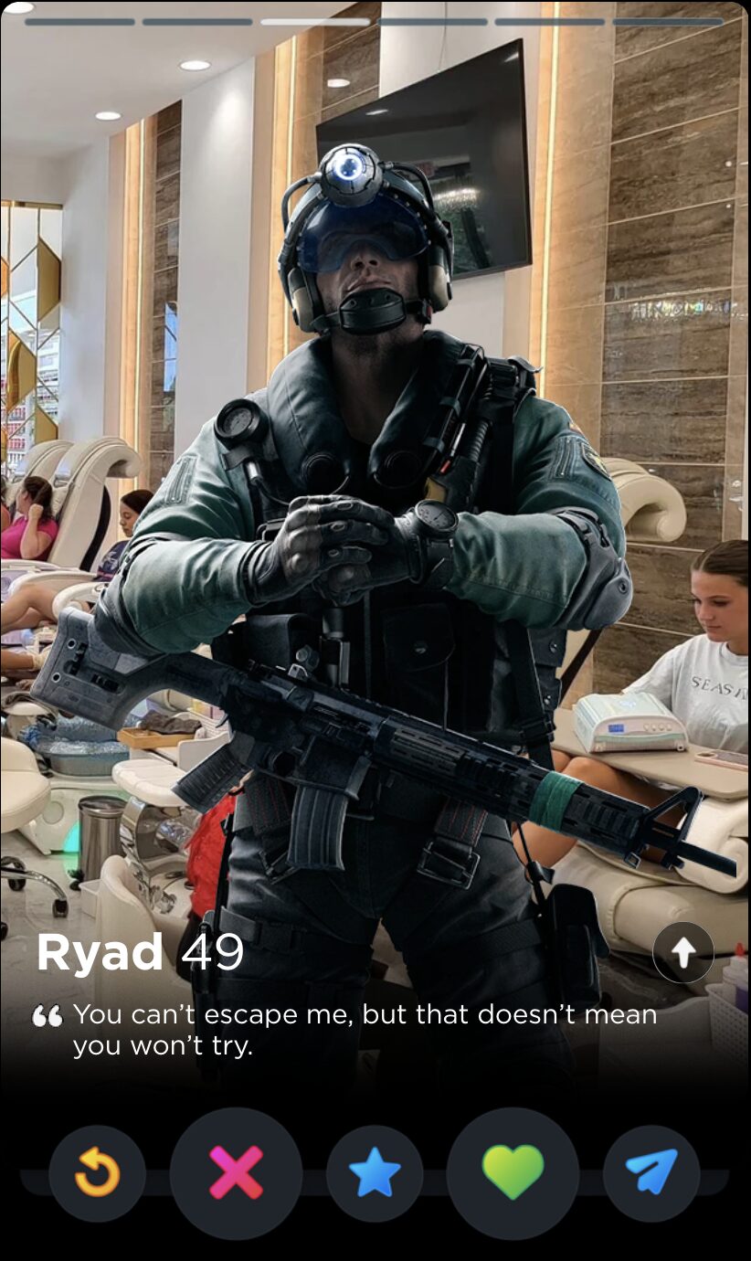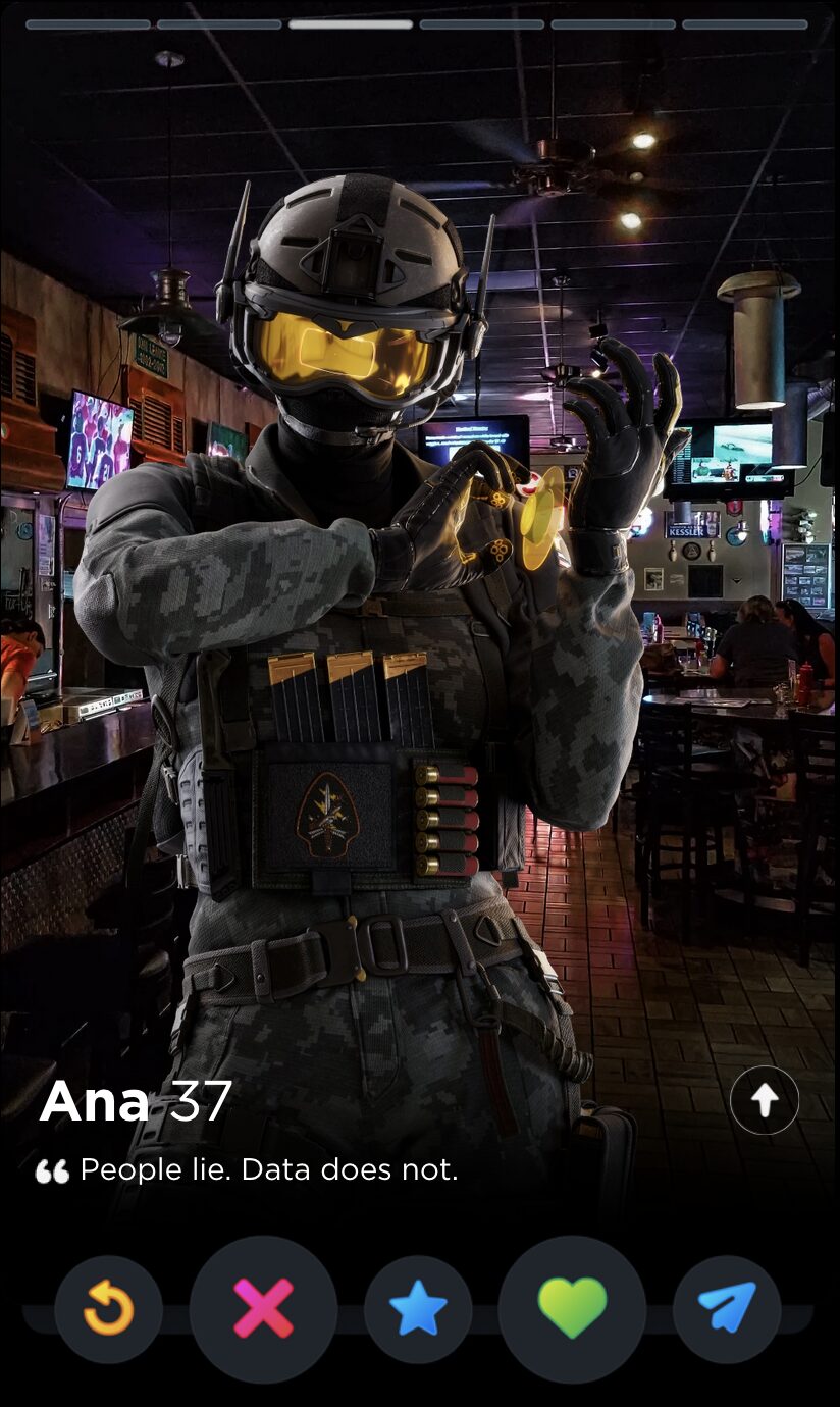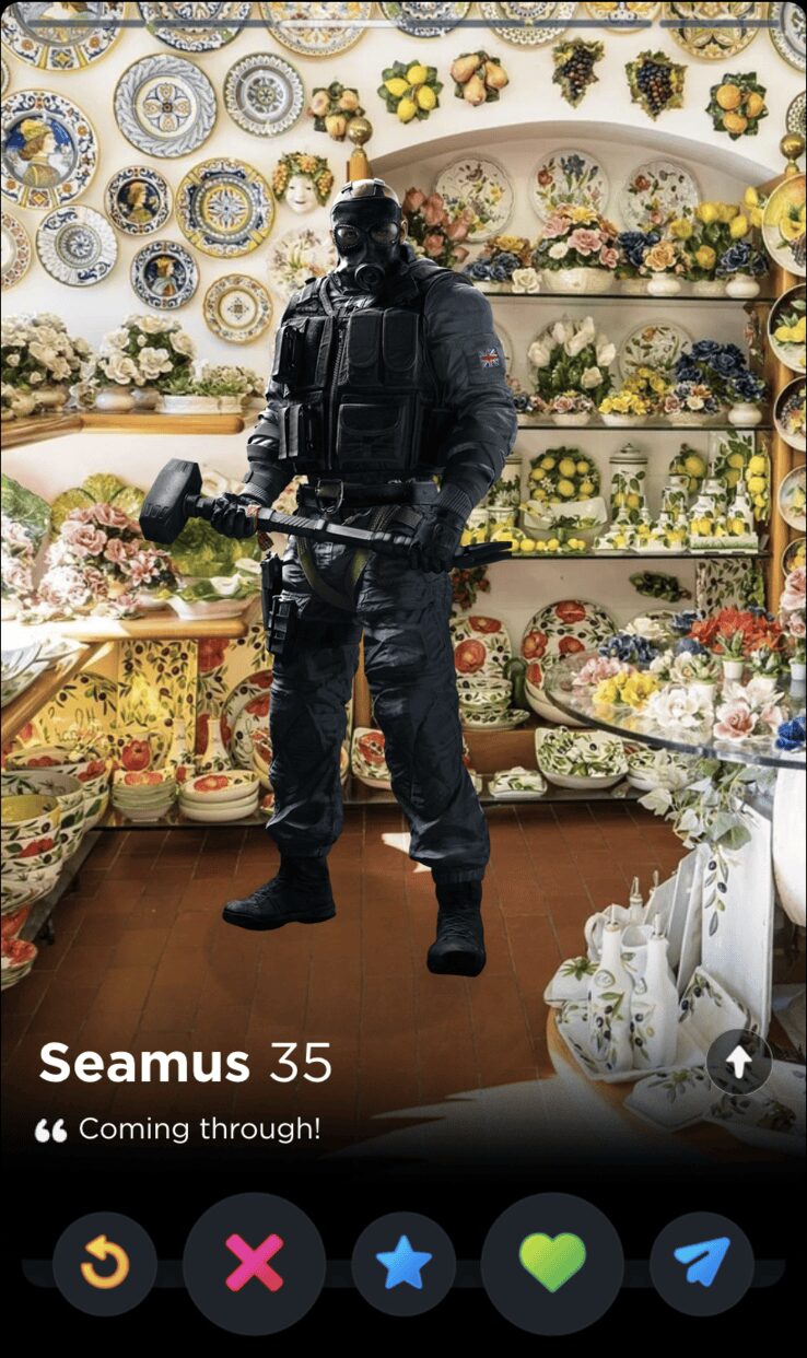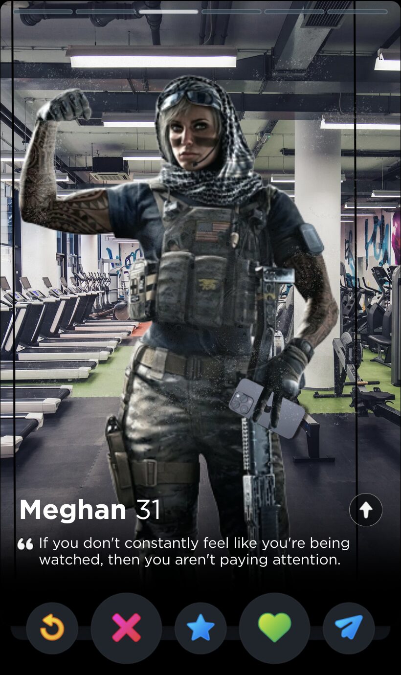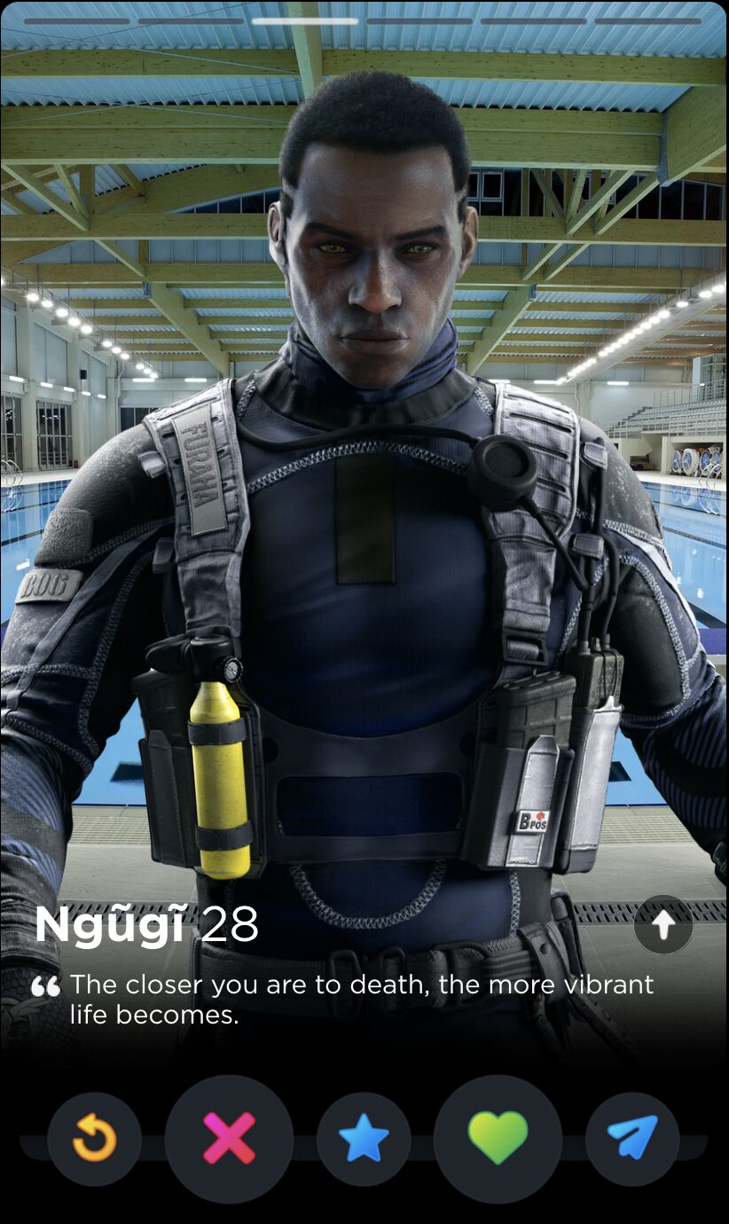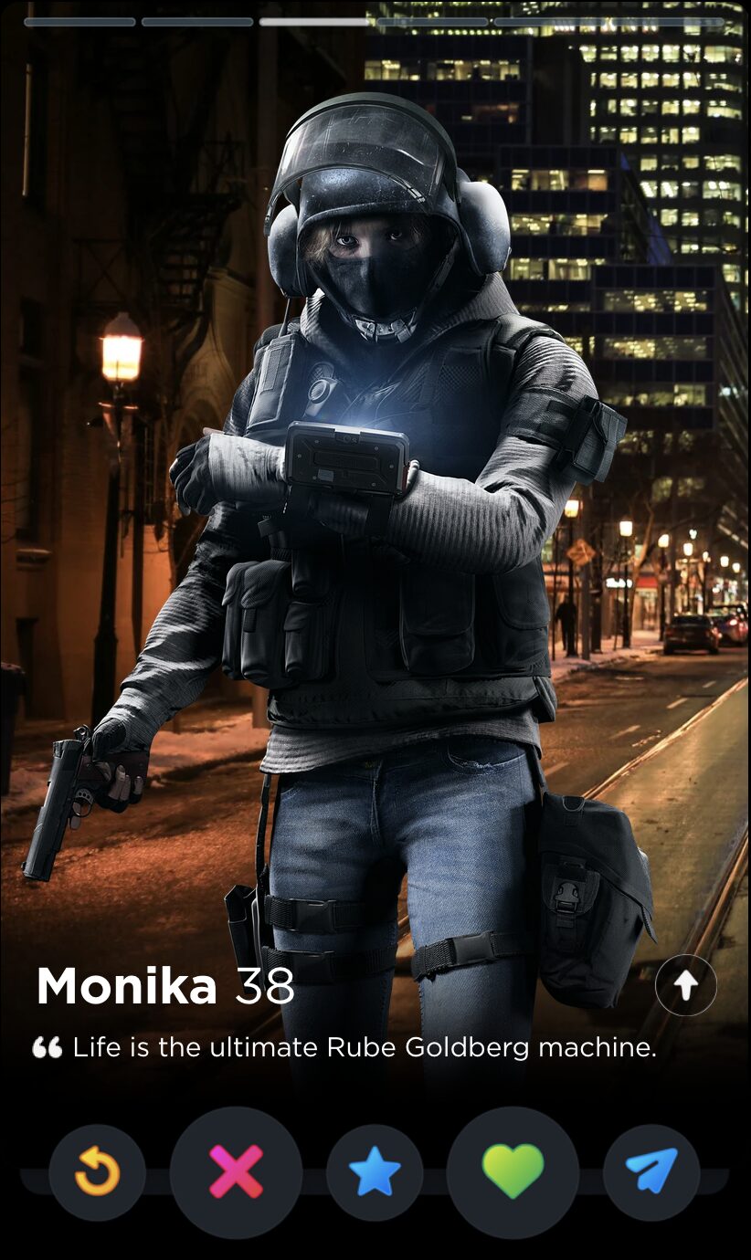 IQ’s quote is fun and full of whimsy, two words I would never use to describe my years playing Rainbow Six Siege. Though it’s a touch impersonal, this is the kind of playful observation that can tell you a lot about someone’s worldview, which makes it a good fit for Tinder, where things like worldview and personality are given as much if not more consideration than appearances.