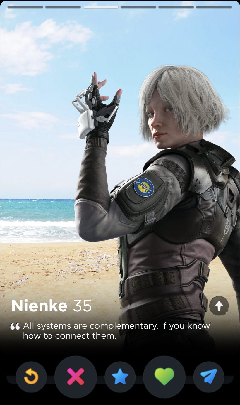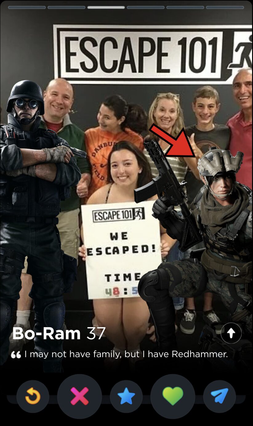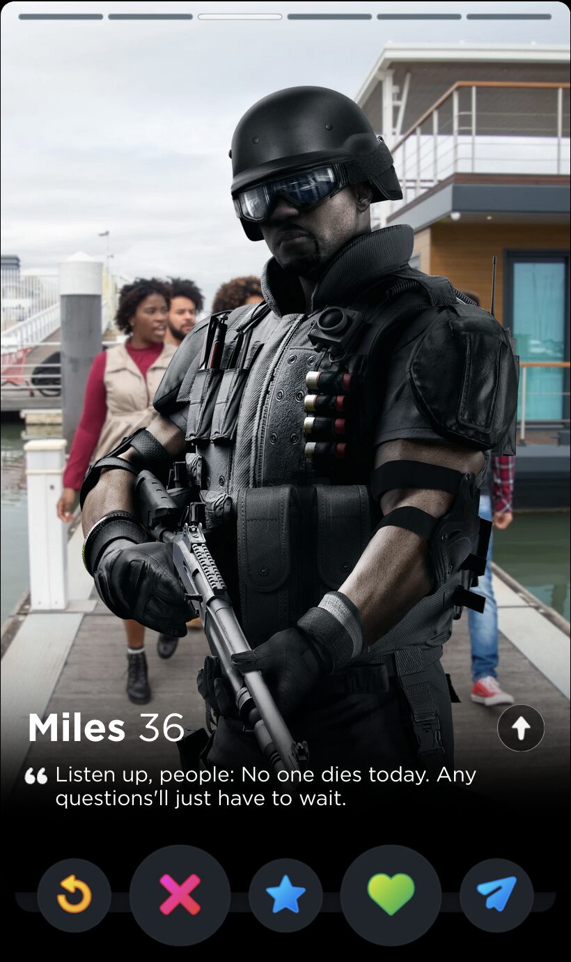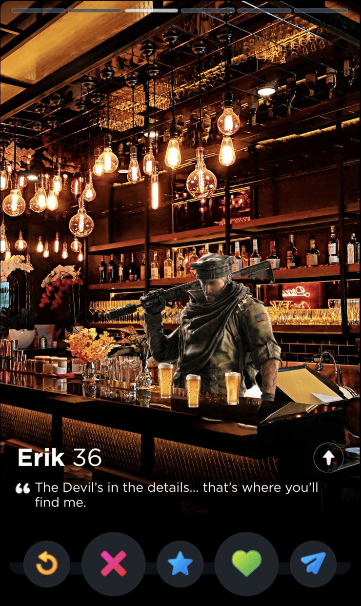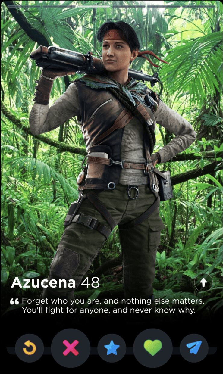 IQ’s quote is fun and full of whimsy, two words I would never use to describe my years playing Rainbow Six Siege. Though it’s a touch impersonal, this is the kind of playful observation that can tell you a lot about someone’s worldview, which makes it a good fit for Tinder, where things like worldview and personality are given as much if not more consideration than appearances.