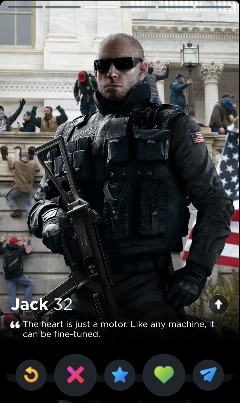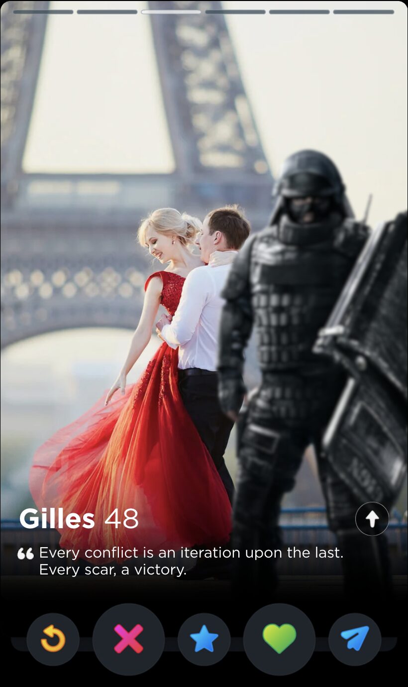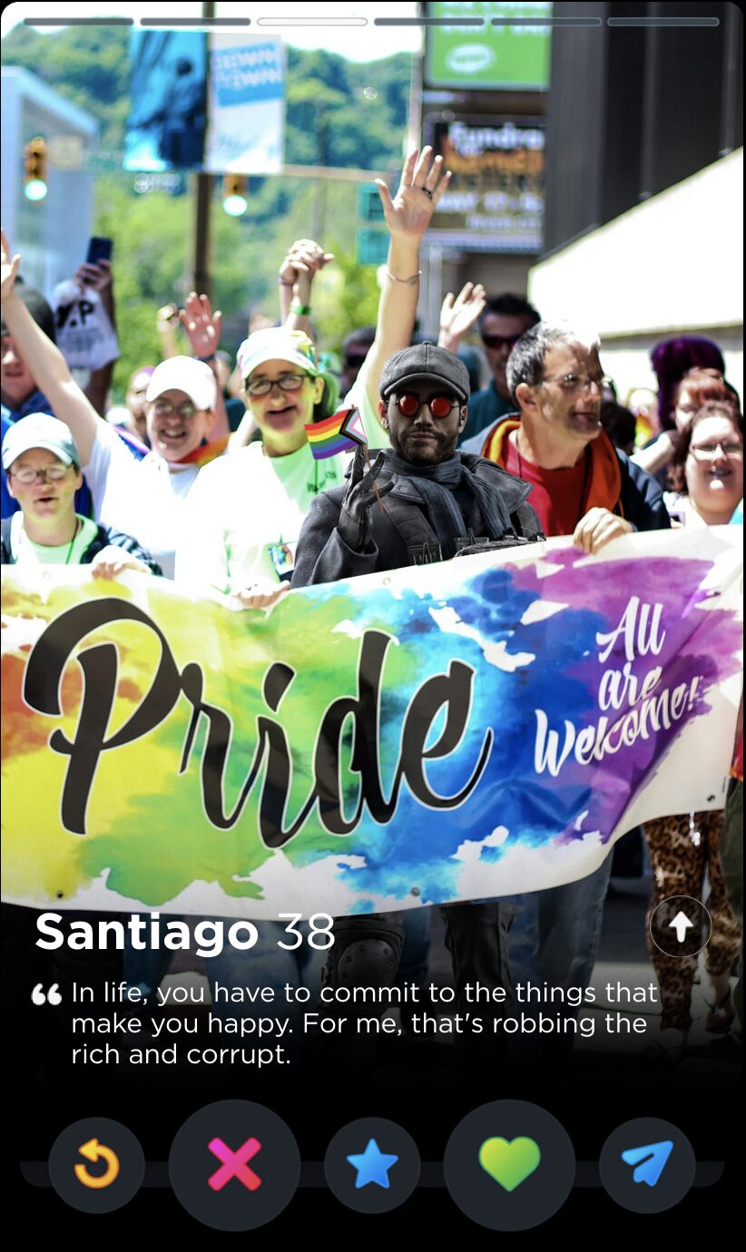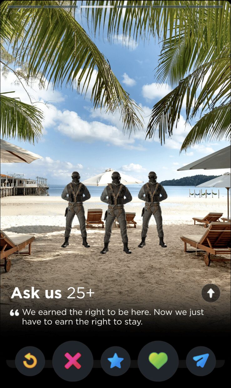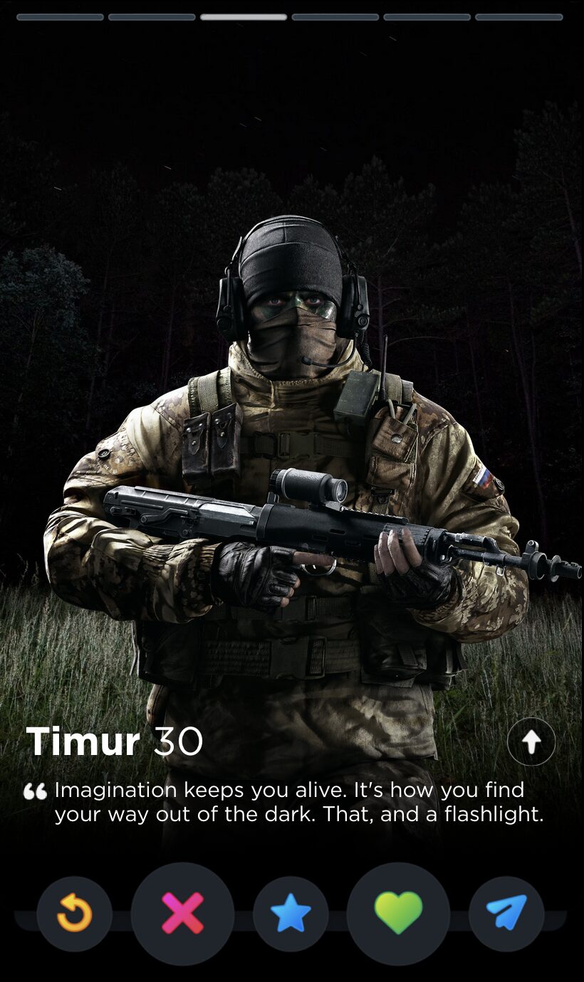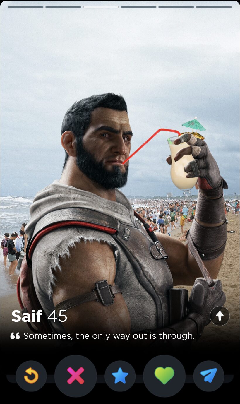 IQ’s quote is fun and full of whimsy, two words I would never use to describe my years playing Rainbow Six Siege. Though it’s a touch impersonal, this is the kind of playful observation that can tell you a lot about someone’s worldview, which makes it a good fit for Tinder, where things like worldview and personality are given as much if not more consideration than appearances.