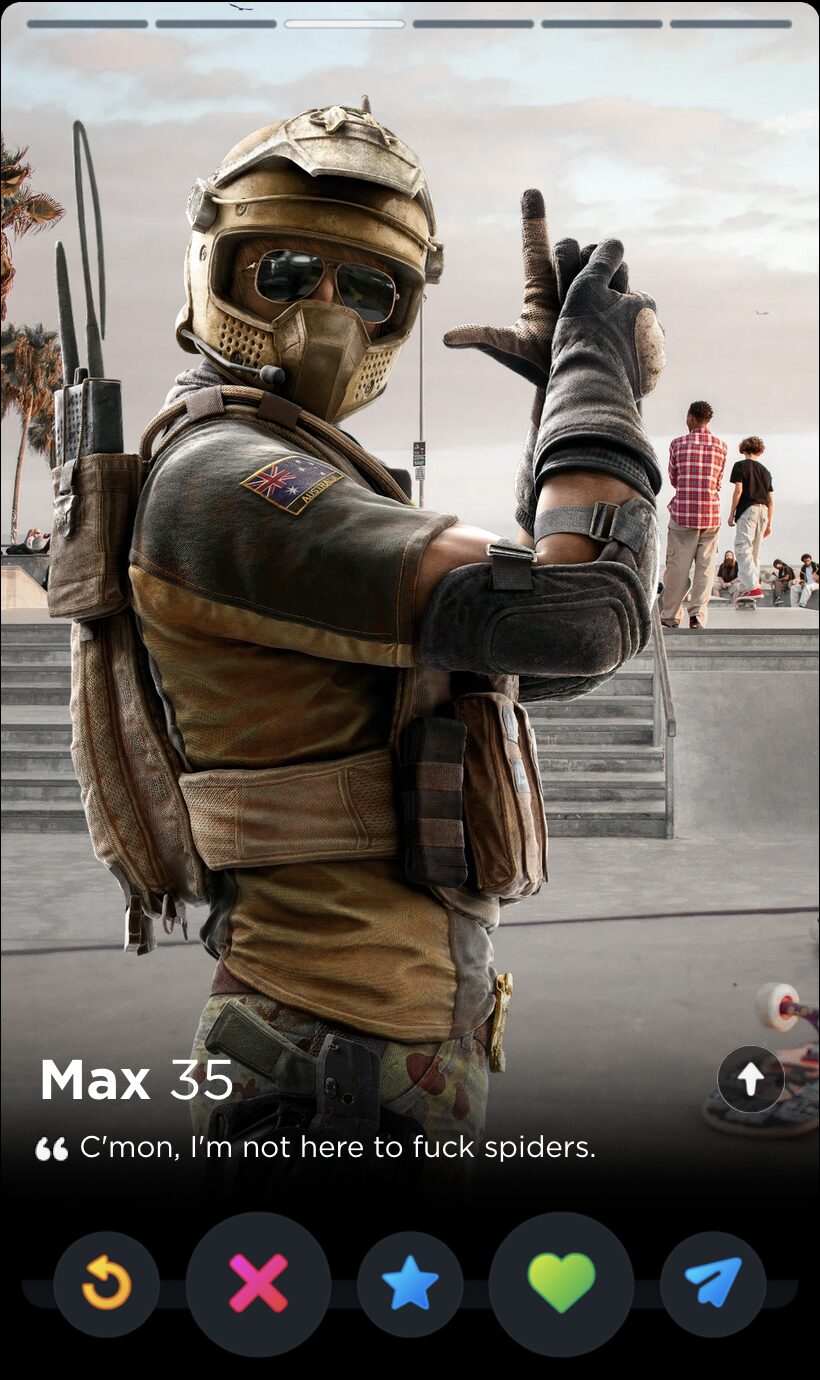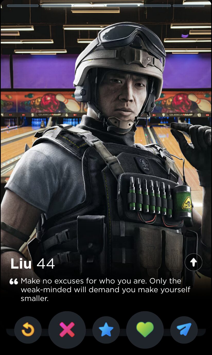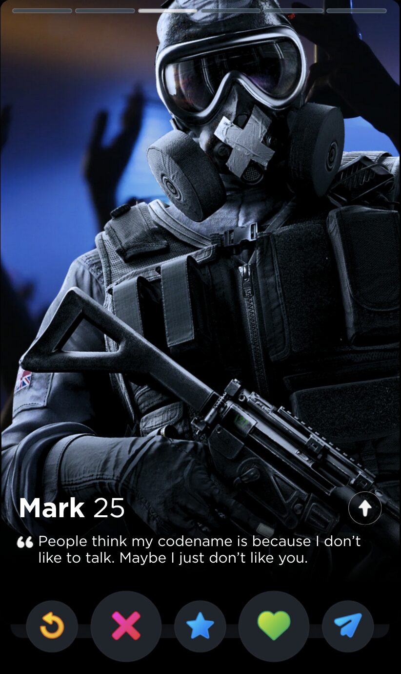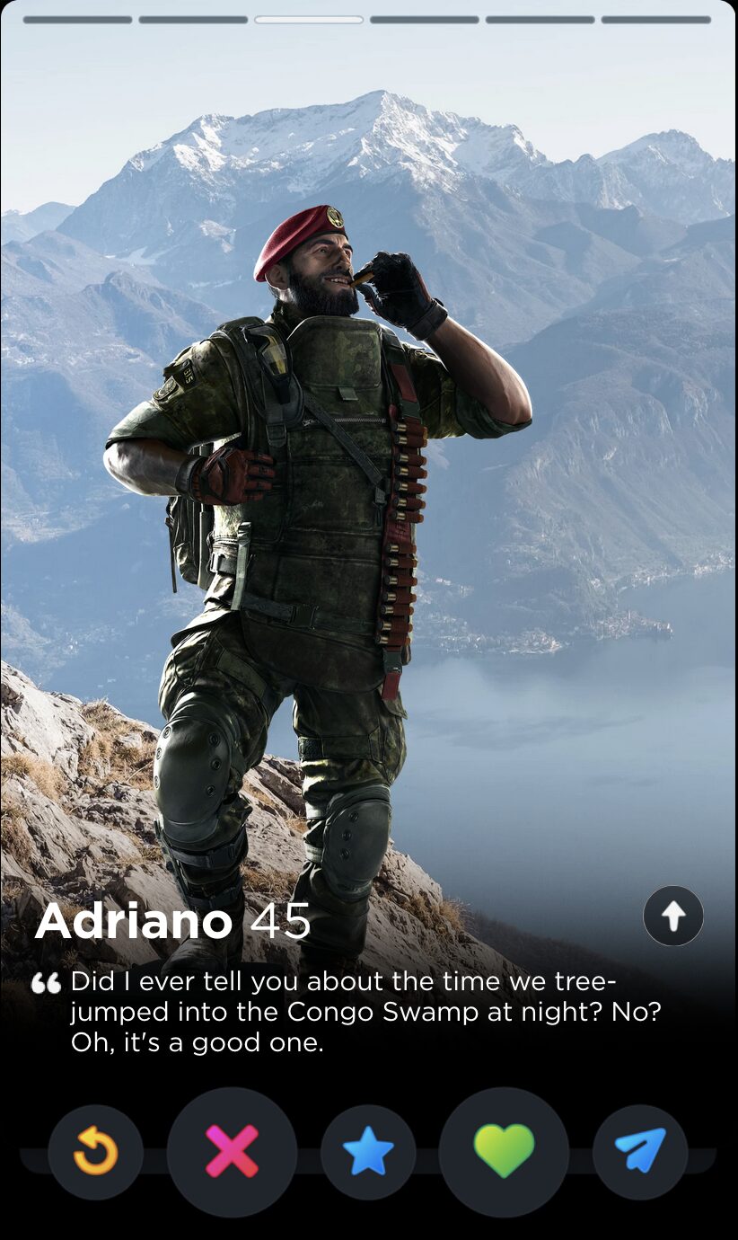 And why shouldn’t they? How can you not come to love their catchphrases, their comically situational gadgets, their highly questionable rules of engagement? Ubisoft spends a frankly inordinate amount of time writing biographies, interviews, and “psychological reports” for all of their Operators, but the star of the show has to be the silly little quotes. Sorry, not silly. They are oh so very serious: bolded quotes that sum up the whole of the character’s ethos and personhood, much like one’s bio in an equally competitive scene dominated by toxic males obsessed with your body count: dating apps. With that in mind, here is every Rainbow Six Siege Operator quote ranked by how hard they’d go as Tinder bios.