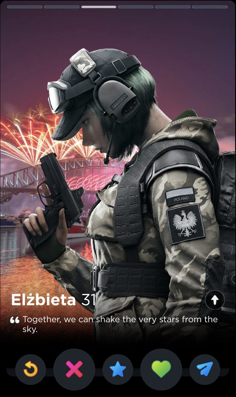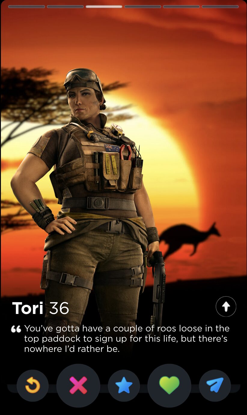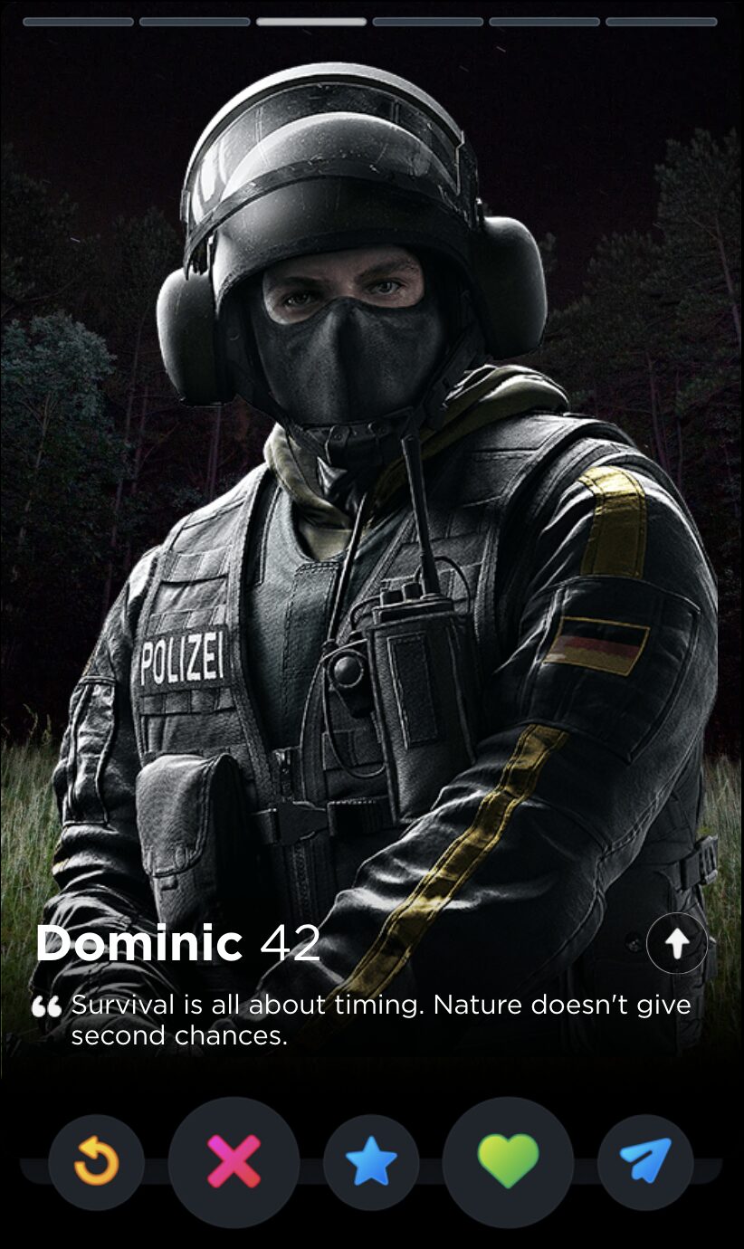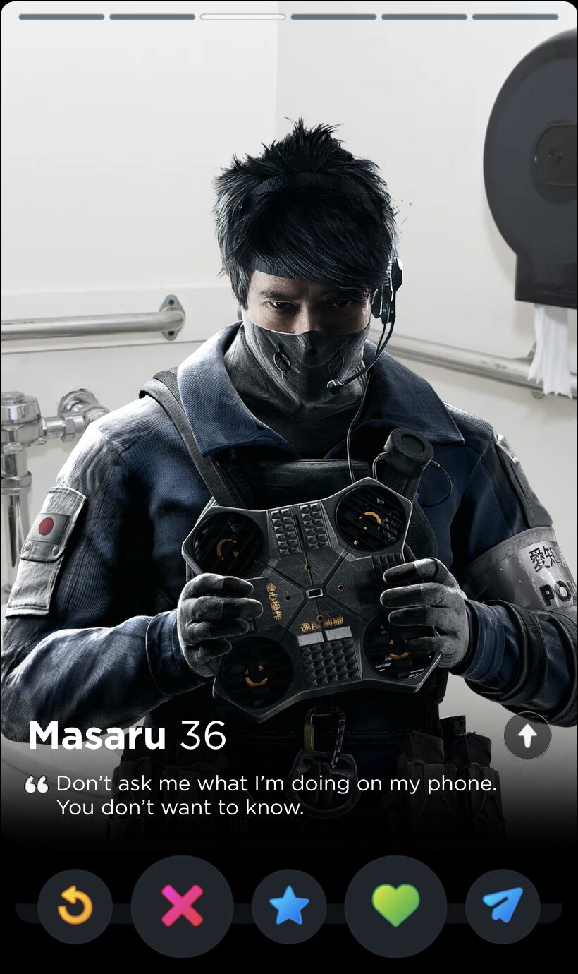 And why shouldn’t they? How can you not come to love their catchphrases, their comically situational gadgets, their highly questionable rules of engagement? Ubisoft spends a frankly inordinate amount of time writing biographies, interviews, and “psychological reports” for all of their Operators, but the star of the show has to be the silly little quotes. Sorry, not silly. They are oh so very serious: bolded quotes that sum up the whole of the character’s ethos and personhood, much like one’s bio in an equally competitive scene dominated by toxic males obsessed with your body count: dating apps. With that in mind, here is every Rainbow Six Siege Operator quote ranked by how hard they’d go as Tinder bios.