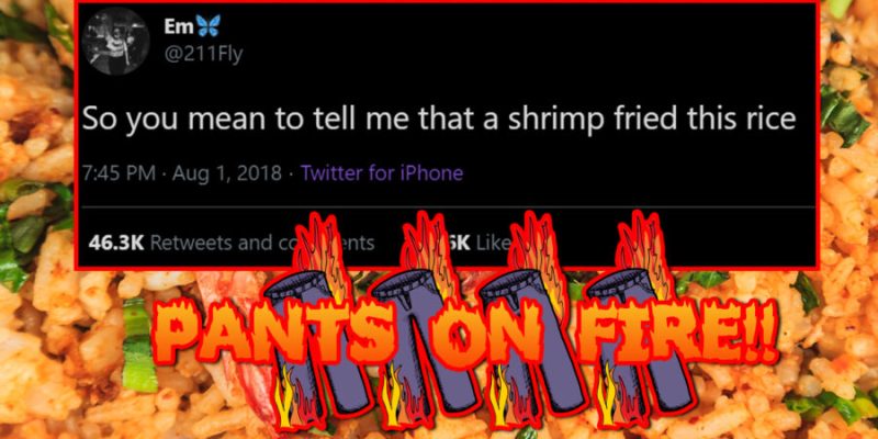 Recently we have been seeing a multitude of people on social media claiming that Shrimp Fried Rice got its name from the fact that a “shrimp fried this rice.” It’s time to set the record straight once and for all. Hard Drive gives this claim that “a shrimp fried this rice” a PANTS ON FIRE rating, our starkest ranking of falsity.