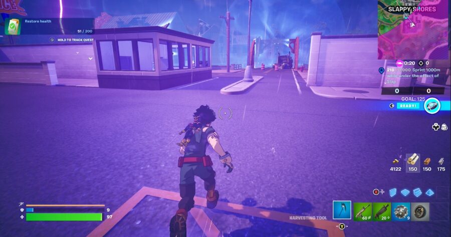 This should turn your stamina bar orange, which denotes the Slap effect, then sprint around the factory until the effect wears off. Repeat until you reach 1000m!