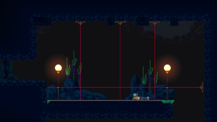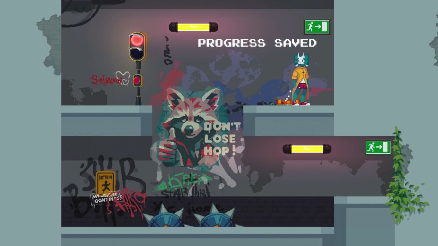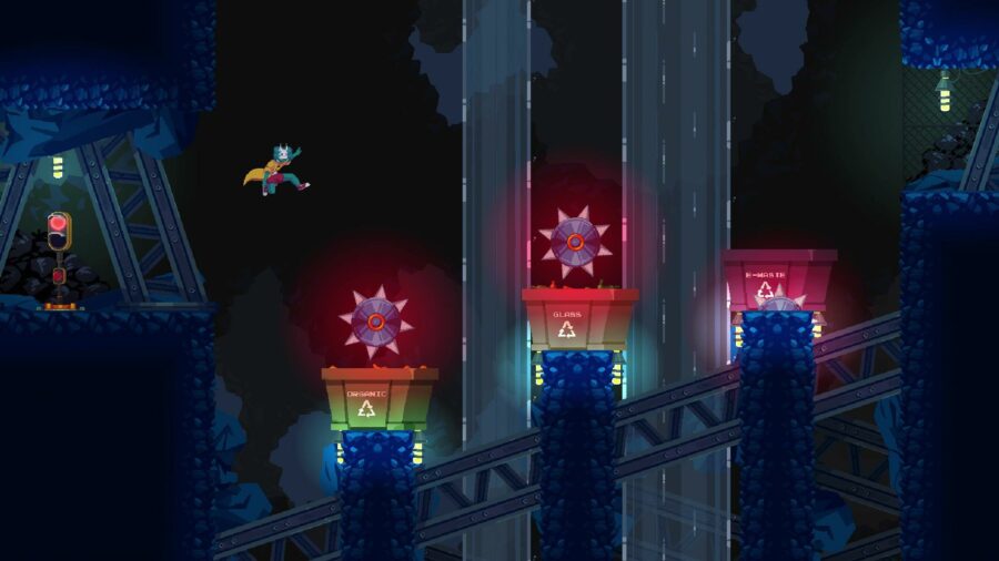 Since no one in Peppered’s city can permanently die, nobody cares about basic safety measures, so entire industrial zones have been made from live wires, open flame, laser grids, and running buzzsaws. In fact, you can only get through certain areas by deliberately killing yourself at the right time or place so you can respawn in the next room.