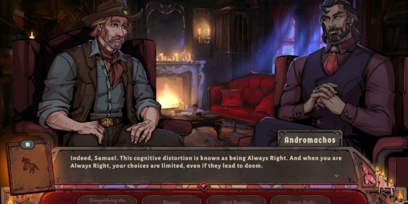 The overall idea behind VT seems less about testing your deductive skills and more about introducing the concept of cognitive distortions to the player, so you can be more mindful of the ways in which you treat yourself. It’s subtle, as VT is primarily presented as Sam himself learning to come to grips with the flaws in his thinking, but it gave me a lot to think about along the way.