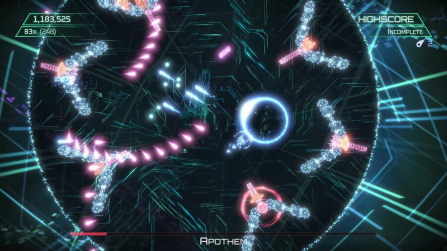 That’s the most common gimmick, but there are multiple modes in Cyberpulse that change things up by adding new rules, taking away the zone, adding power-ups, or throwing in new types of enemies. It ends up feeling like the Tetris Effect of arcade shooters, where each new stage might turn into Asteroids or R-Type or a Touhou game as you go.