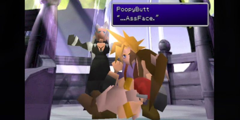 “I was playing this kinda half ironically. I named the blonde guy PoopyButt, which is hilarious and then there was this girl character that I named AssFace,” Hughes explained, wiping tears away. “But when, spoiler alert, Sephiroth kills her, I was screaming, ‘AssFace no!’”