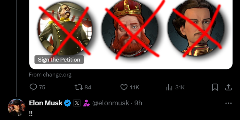 “Civilization is a cornerstone gaming franchise but it has been corrupted by woke activists who infiltrated the media industry. The trailer reveals their DEI agenda: there are dozens of ethnic leaders — this is intolerable, and we demand our own representation in a leader who wants to eradicate them all. And until we get our way, we the undersigned agree to not buy this game unless it reviews really well.”