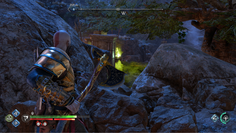 From the elevated altar you’ll be able to see a gateway to the north (this is normally blocked in the daytime). Head through it and follow the left hand side until you find a dead end overlooking a Seiðr camp. Use your Leviathan Axe to freeze the poison totem closest to you.
