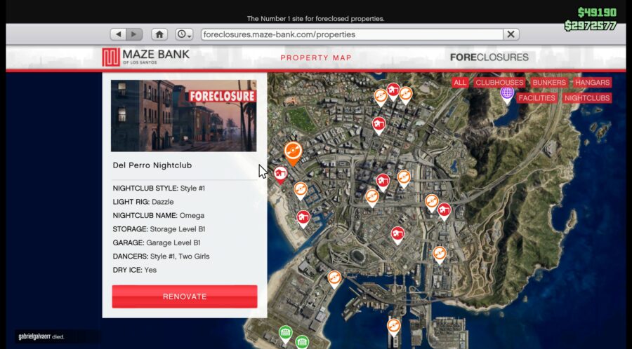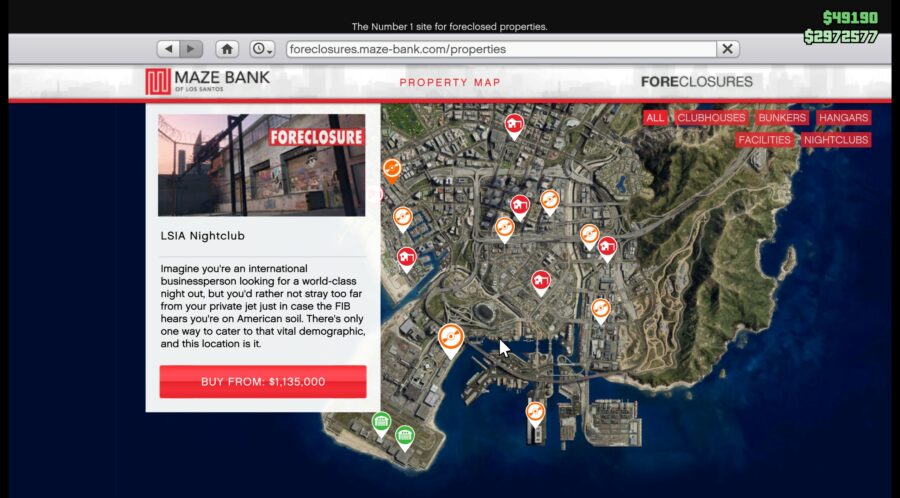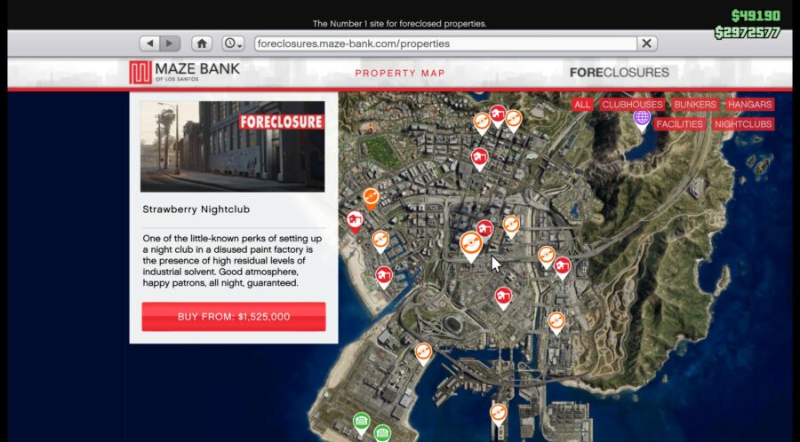 This nightclub can be extremely convenient if you’re a frequent flyer. Located at Los Santos International Airport, this property might not be the prettiest, but the location is extremely easy to get to. This is a property you can expect to earn you a nice chunk of passive income, especially if you upgrade it and regularly drop by. This nightclub is priced at $1,135,000, which again, is cheap compared to the other locations on this list.