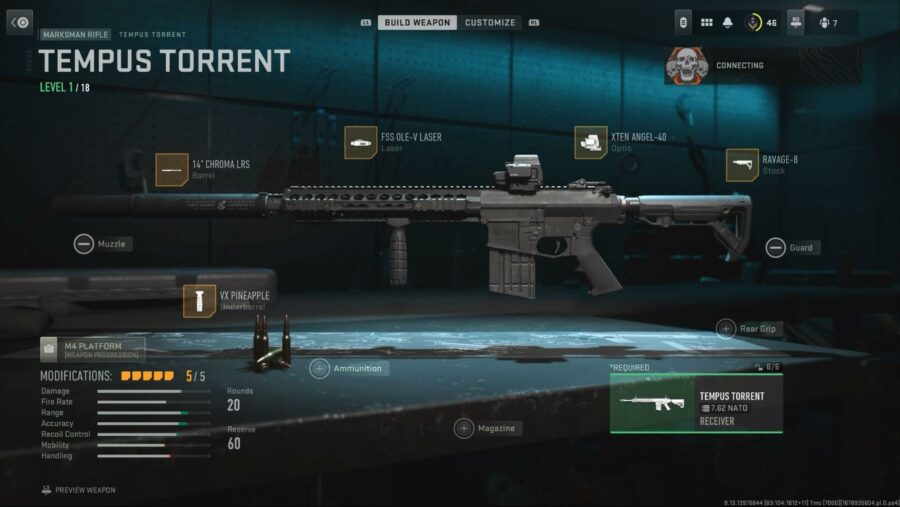 For the MW2 loadout, we focused on improving the range and accuracy of this marksman rifle. The FSS Ole-V Laser and Ravage-8 Stock both improve the Aim Down Sight (ADS) speed of the rifle. The 14’’ Chroma LRS Barrel improves the range and bullet velocity as well as providing much-needed sound suppression. The VX Pineapple improves fire accuracy and recoil control from the hip. Finally, the XTEN Angel-40 is chosen as the optic here as it has the precision sight picture and indicates the target range.