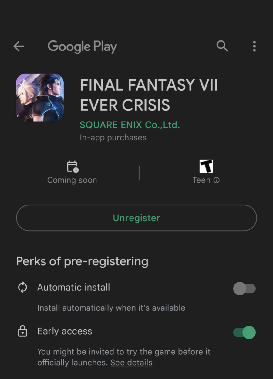 The sign up to get access to the Final Fantasy Ever Crisis beta is through the Play Store. Make sure that when you do this, you also check the toggle for early access. If you don’t see the toggle and you’re on desktop, it’s worth logging in on your mobile device to see if the toggle is there. Then, once invites go out for the beta, you will be notified in Google Play if you have been selected as a closed beta tester. Pre-registration for this beta is open from June 8-28, so make sure you register by June 28 to play!