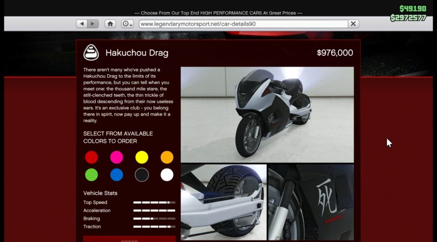The Hakuchou Drag is one of the fastest motorcycles available in GTA Online. The price for this vehicle is just under $1,000,000, however, that price is more than justified when looking at what this bike offers. For time trials, the Drag is a perfect choice to race past all of your competitors. There are multiple upgrades available to increase the performance of this motorcycle, however, those will cost you as they are not cheap at all. If you use the Hakuchou Drag in plenty of races around the map, you could be looking at a nice payout each week.