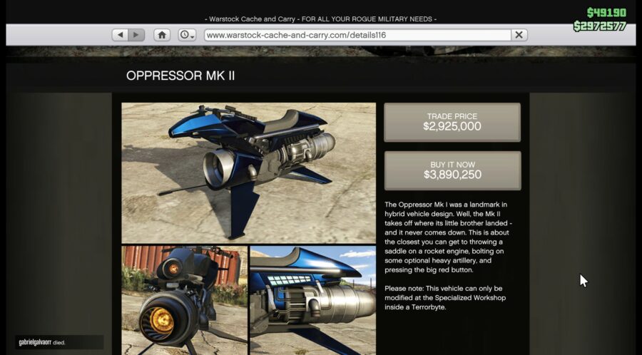 The Oppressor Mk I is, simply put, one of the fastest motorcycles available in GTA Online. Its speeds easily tops almost all of its competition, even that of the Oppressor Mk II. The neat feature with the Oppressor is the ability to fly and use a boost to gain height. The motorcycle has wings on the back of it that allow it to glide through the air. Additionally, this motorcycle has homing missiles that you can use against any aerial or ground vehicles. While this is a great option for those looking for a sweet deal, we wouldn’t recommend purchasing this motorcycle over the upgraded model, the Oppressor Mk II, as it is better than the original model in plenty of ways.
