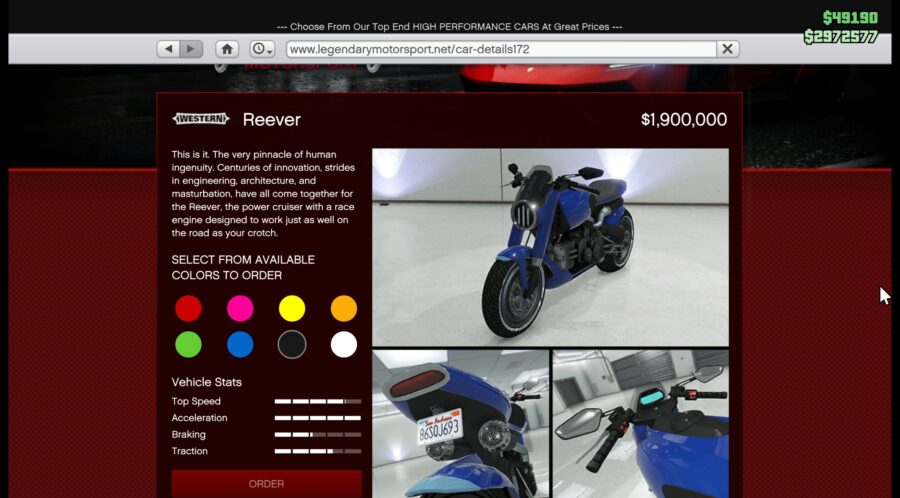 The Western Reever has the fastest speed out of any motorcycle in GTA Online. Additionally, the acceleration is also the fastest, meaning you’ll be able to speed ahead of any threats in a heartbeat. If you end up buying this motorcycle, be sure to tune it up and upgrade some of its features to increase the traction. You’ll want to do this as it doesn’t handle as smoothly as some of the other motorcycles on the list. For a whopping $1,900,000, you can purchase the blazing fast Reever at Legendary Motorsport.