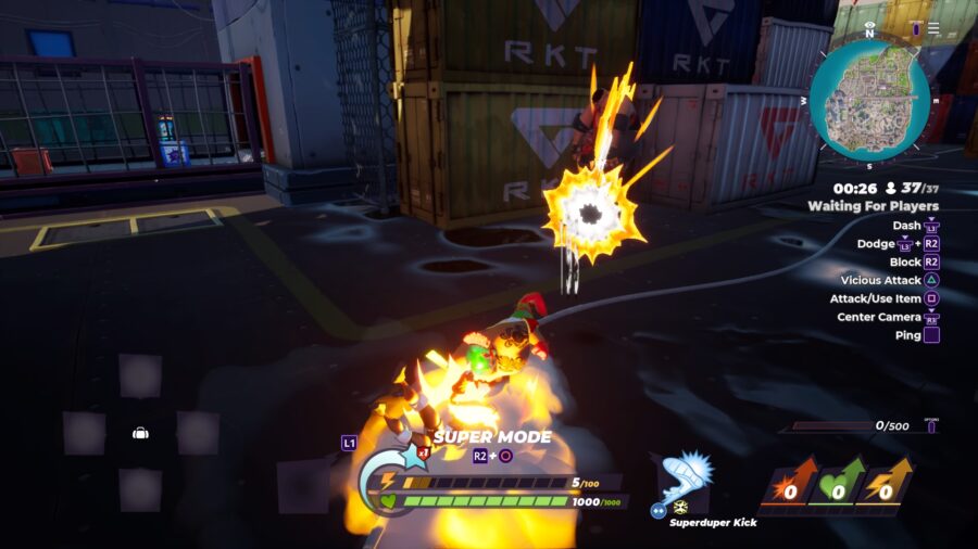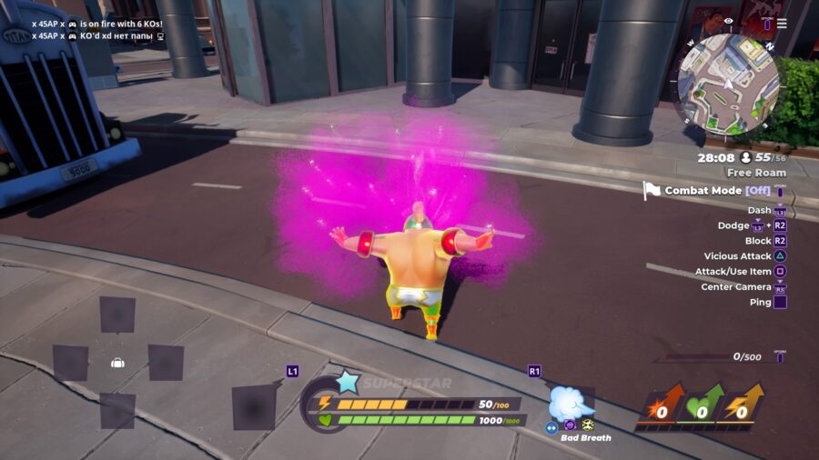 Superduper Kick (S, 195 DMG raw, 10×2+220 DMG charged) – The Superduper Kick does a healthy amount of damage for a Strike and can send your opponents flying off of buildings for fall damage, or splat them against walls for a follow-up attack. It has fairly quick start-up as well, though obviously that is less true when charged. Fully-charged, it can launch opponents far enough that it allows you to make a quick getaway if necessary. Nothing particularly outstanding about it, just a really solid move all around.