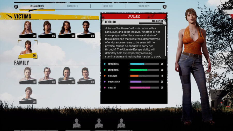 Julie has high stealth, which is crucial in staying undetected from the family. Additionally, her Ultimate Escape ability helps in reducing stamina drain and also makes her harder to track. This ability is suited more to a solo-survivor style play rather than working together as a team which makes her a weak choice. And the ability itself is only useful when she is near an exit or when a killer is near.