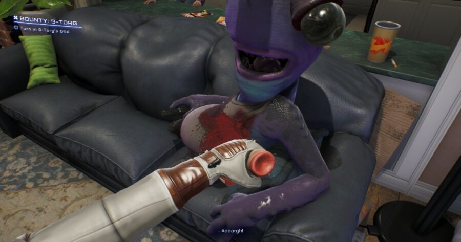More specifically, the moment comes up after returning from your first bounty. You’ll rescue Knifey along the way, Gene’s sentient alien knife who wants to stab and violently murder everything. As soon as he finds out you know Gene, he’s eager to let you know how much he’d like to stab him too. The option to do so will be presented once you get back to the house.