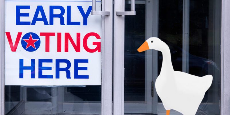 The avian culprit was the cause of several hijinks at the voting site, such as stealing pens from every booth and scattering voter rolls across the floor. The goose was also able to cut through a loose wire with its beak, shutting down the site’s sole vote counting machine before rogue Republican poll workers could.