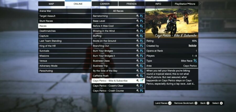 Note that any of the Cayo Perico races will work, because of the nature of the Cayo Perico session that will be created–it does not snow in Cayo Perico, just Los Santos.