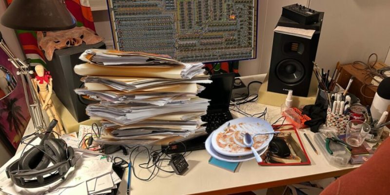 Thompson’s Factorio base, a sprawling industrial complex, is reportedly a marvel of organization and optimization that perfectly mines and manufactures all the necessary potions and components to create massive amounts of plastic, modules, and all of the game’s most advanced items. Also, it can hardly be seen over the massive pile of shit on his desk.
