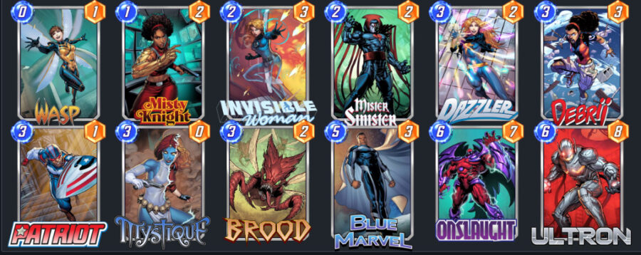 Very similar to the Iron Patriot deck, but without the still-rare Iron Lad card. Tokens are still a pretty rare currency in Marvel Snap, so series 5 cards are hard to get your hands on. We sub out Doctor Doom for Ultron, since no Iron Lad eliminates the chance of an accidental drone swarm. In addition, we sub out Iron Lad for Dazzler, who can become a 3-cost 8-power card with good use of summon cards.