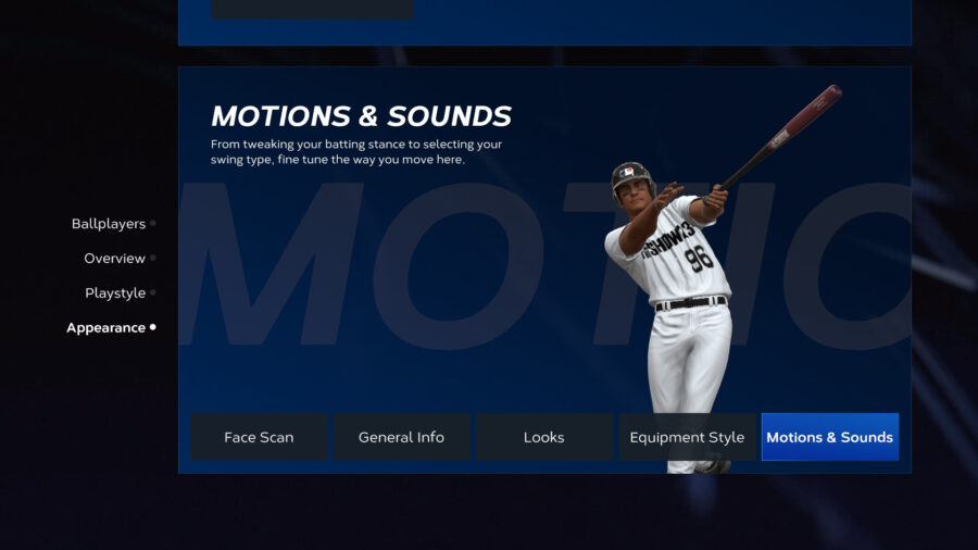 On the main menu you’ll want to go to your profile icon in the top left corner, while in Road to The Show mode you’ll go to the same corner and click on your player’s face. This will take you to the My Ballplayer screen. Scroll down the left side list until you get to Appearance, and then click on the Motions & Sounds button. Click on the following Batting Stance Creator button and you’ll have full control over making your preferred stance.