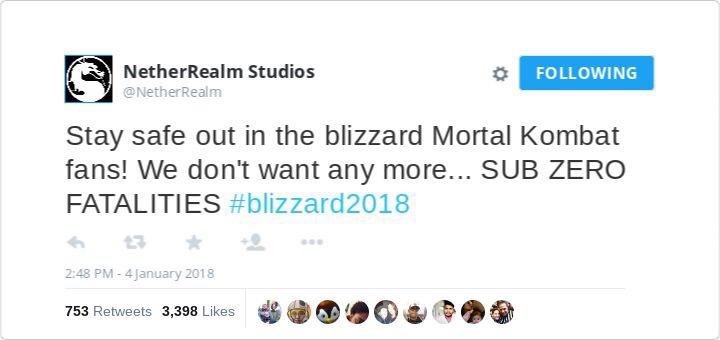 “Stay safe out in the blizzard Mortal Kombat fans! We don’t want any more SUB-ZERO FATALITIES #blizzard2018,” read the since deleted tweet, which has been attributed to a reckless intern.