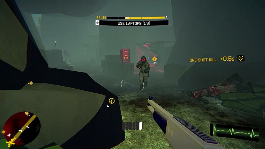 As a result, IAYB could be usefully described as Tom Clancy’s Friday the 13th. Every stage opens with you emerging from hiding to lay waste to another squad of hapless soldiers with whatever you can get your hands on. If you die, it’s more likely that you screwed up than that the soldiers were actually able to kill you.