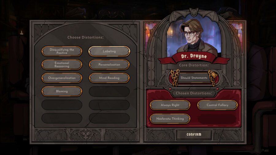 As a game, there’s a lot of Phoenix Wright in VT’s DNA. It’s a choice-based interactive story where Sam has therapy sessions with Andy or his clients, then tries to home in on the unhelpful distortions in his or others’ thinking. These distortions take the form of specific points of objection, which Sam learns about in his sessions with Andy and then tries to put into practice. That, plus the occasional simple minigame, makes up the bulk of VT’s interactivity.