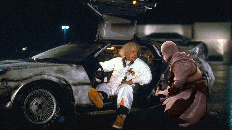 Great Scott! Embark on a time-bending adventure with Doc Brown and a hotwired Animus attached to a DeLorean! Abstergo Industries has recruited Doc to alter the course of history and prevent Ubisoft from creating any more games in the Assassin’s Creed franchise. Travel to the 2000s USA, where you’ll navigate through iconic landmarks and pivotal moments in gaming history.